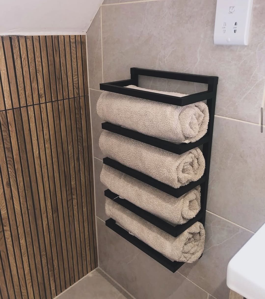 Now this is storage with personality. Rolled towels stacked into a slim wall rack instantly feel spa-like, but still super practical for everyday use.