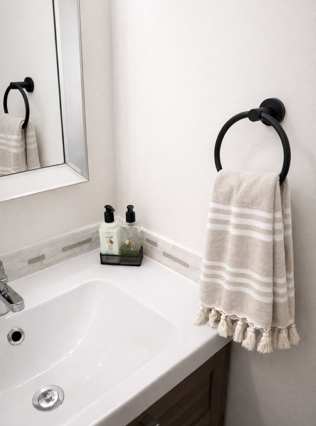 This is one of those “why complicate it?” moments. A clean black ring, a soft neutral towel with a little fringe detail—and suddenly the whole corner feels styled without even trying.