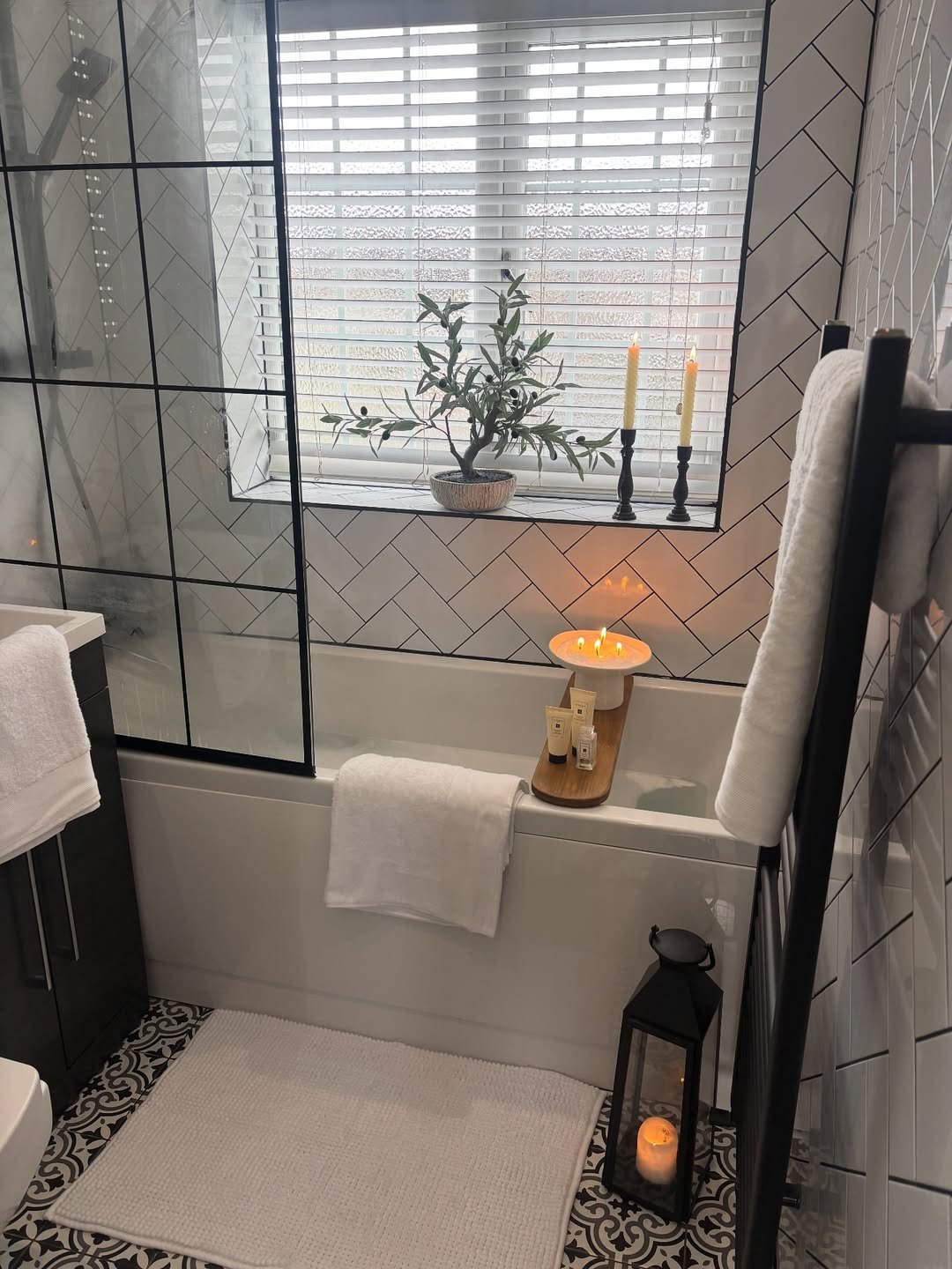 What makes it work is the layering. Soft folded towels, warm candlelight, and that little plant moment by the window—it feels intentional without trying too hard. The kind of space that invites you to slow down for a second.