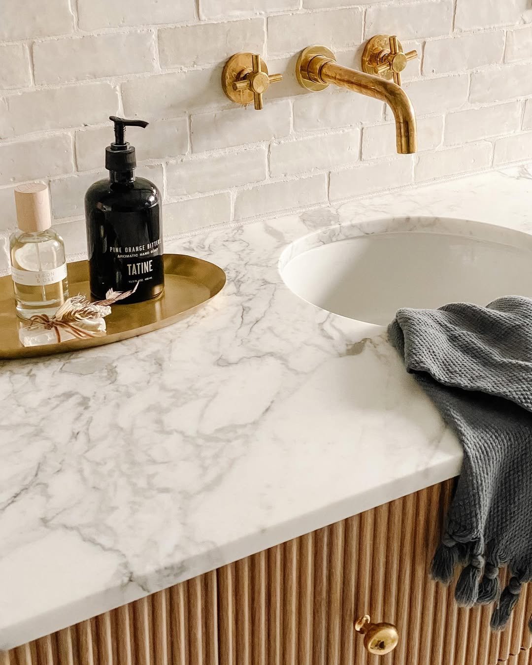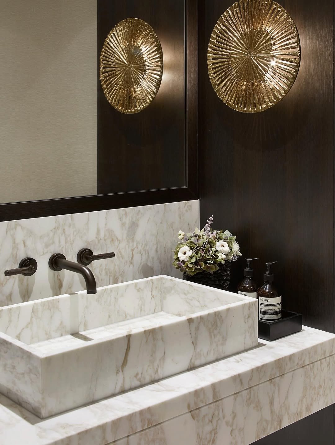 Okay, this one’s got attitude. That bold brass faucet against the marble backsplash? Instant statement.