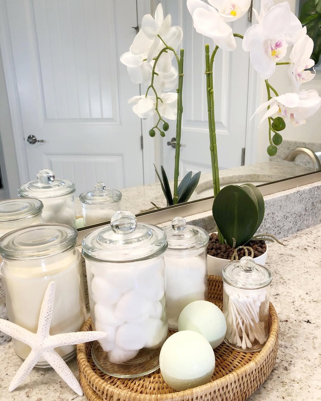 Everything here feels fresh and breezy. The glass jars, soft whites, and woven tray create that airy, beachy look without being too themed.