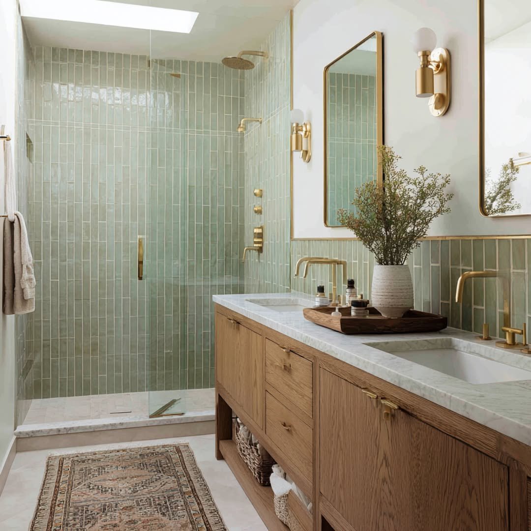 There’s something so calming about this space. The soft green tiles, warm wood vanity, and that simple tray setup—it all flows together beautifully.