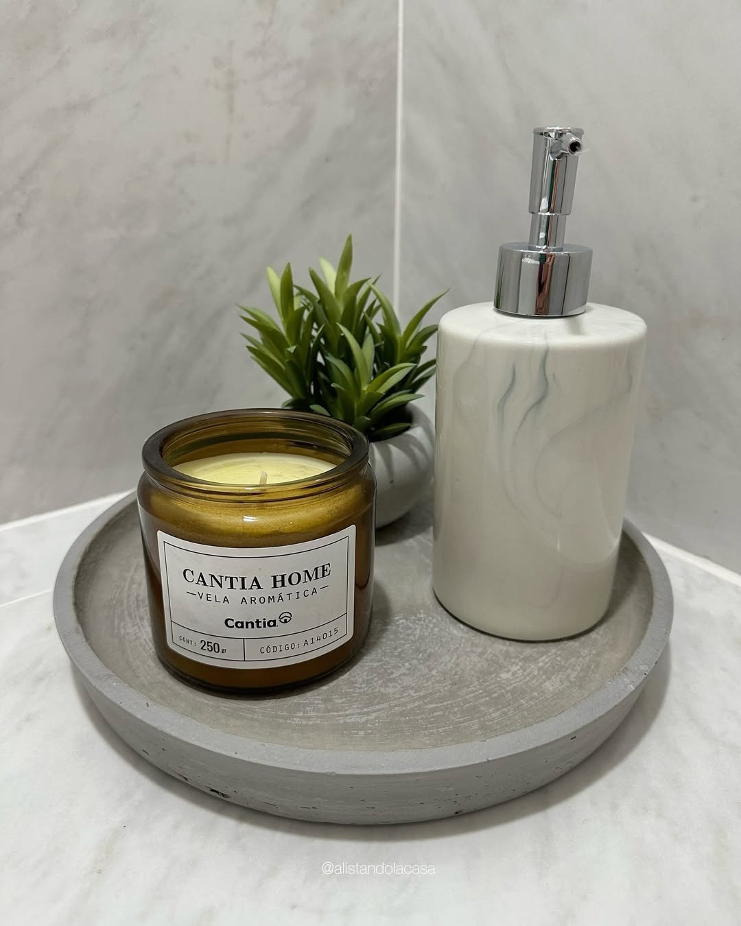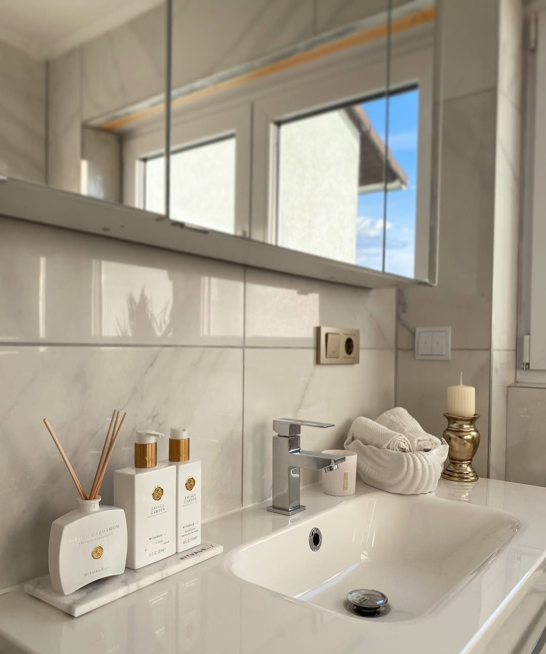 This one is all about that clean, spa-like simplicity. A soft marble tray, a muted soap dispenser, and a single candle—nothing extra, nothing loud. It feels calm the second you look at it.