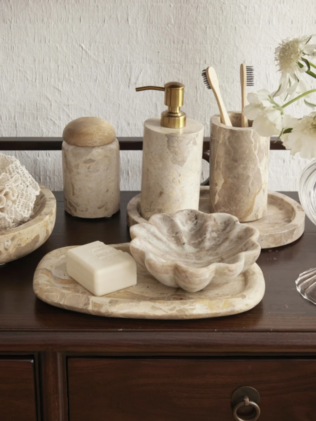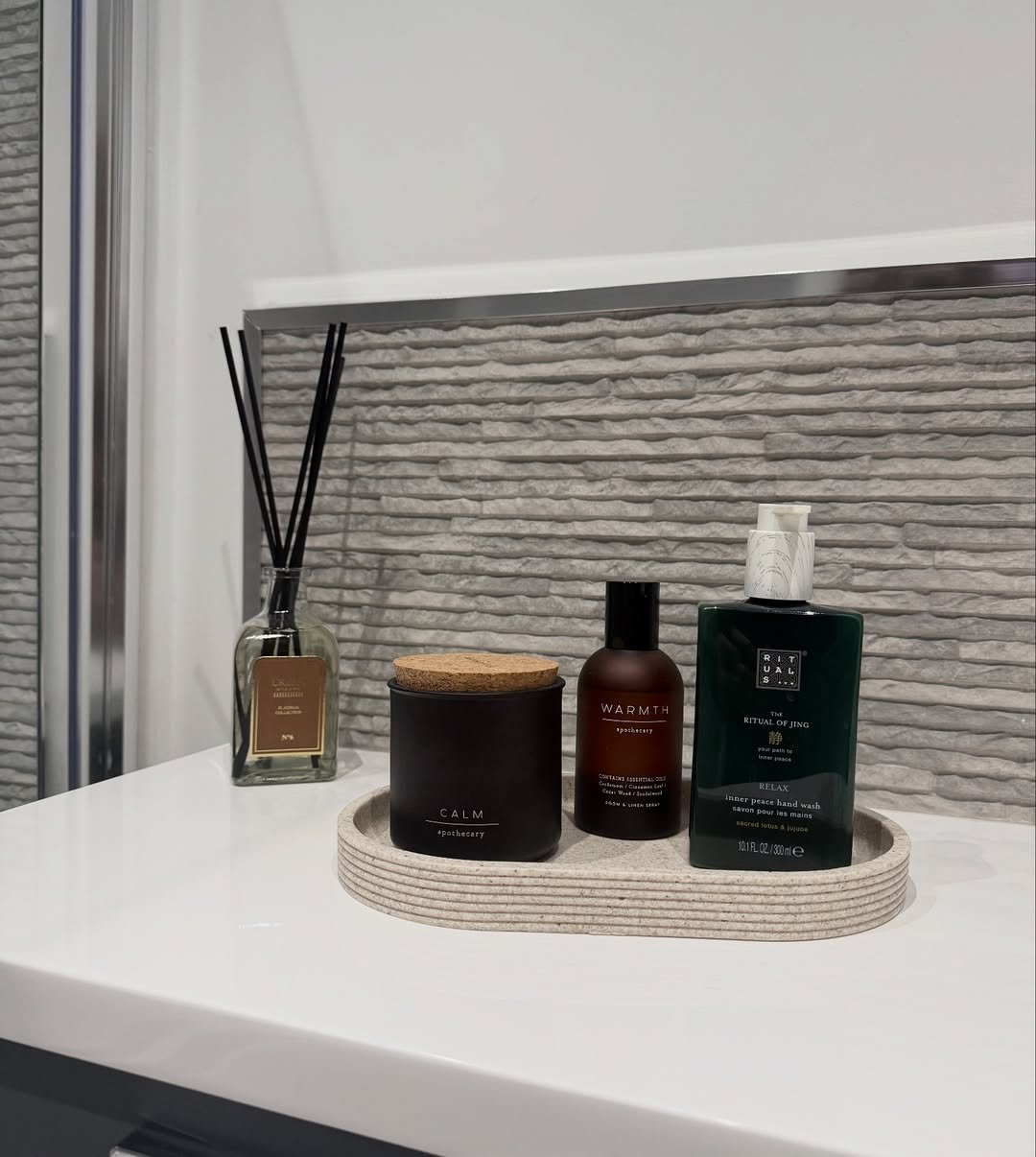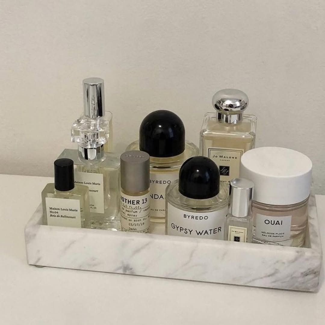 Okay, this one’s a bit of a show-off—in a good way. The marble tray filled with luxe bottles feels polished, clean, and very intentional.