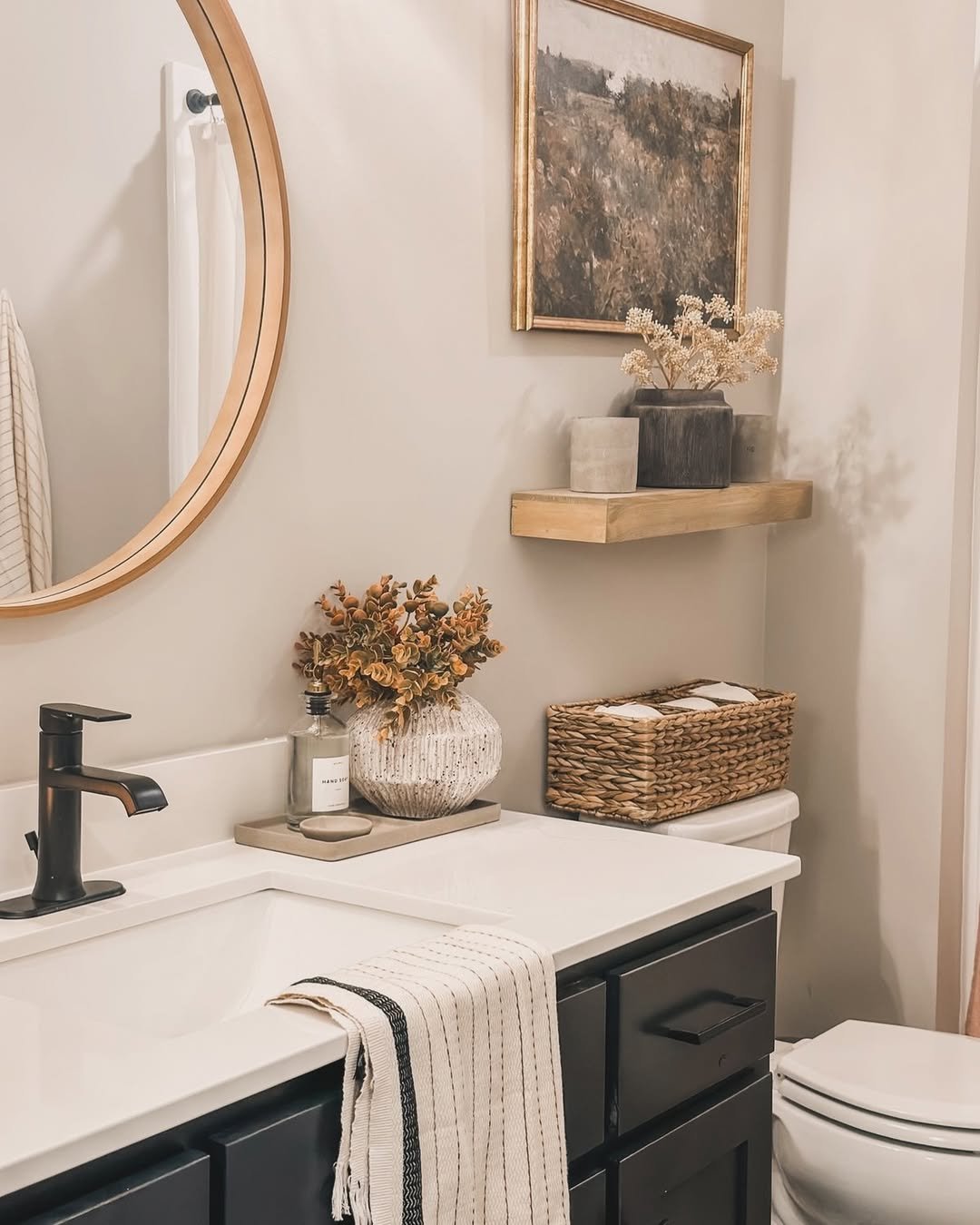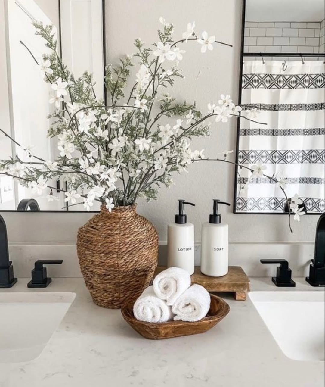 Now this is how you soften a bathroom space. That woven vase with delicate florals instantly warms things up, while the tray keeps everything grounded and intentional.