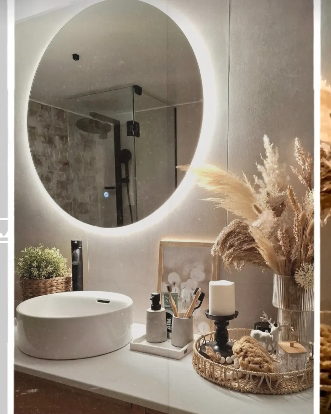 And I love how cozy it feels. Towels, greenery, and those amber bottles—it’s giving warm, lived-in charm in the best way.