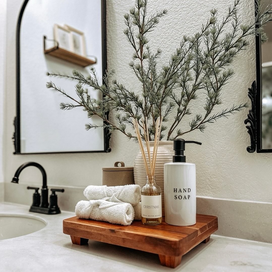 This little setup is doing exactly what it needs to—nothing more, nothing less. A chunky wooden tray, soft rolled towels, and that clean “HAND SOAP” bottle keeping things simple but styled.