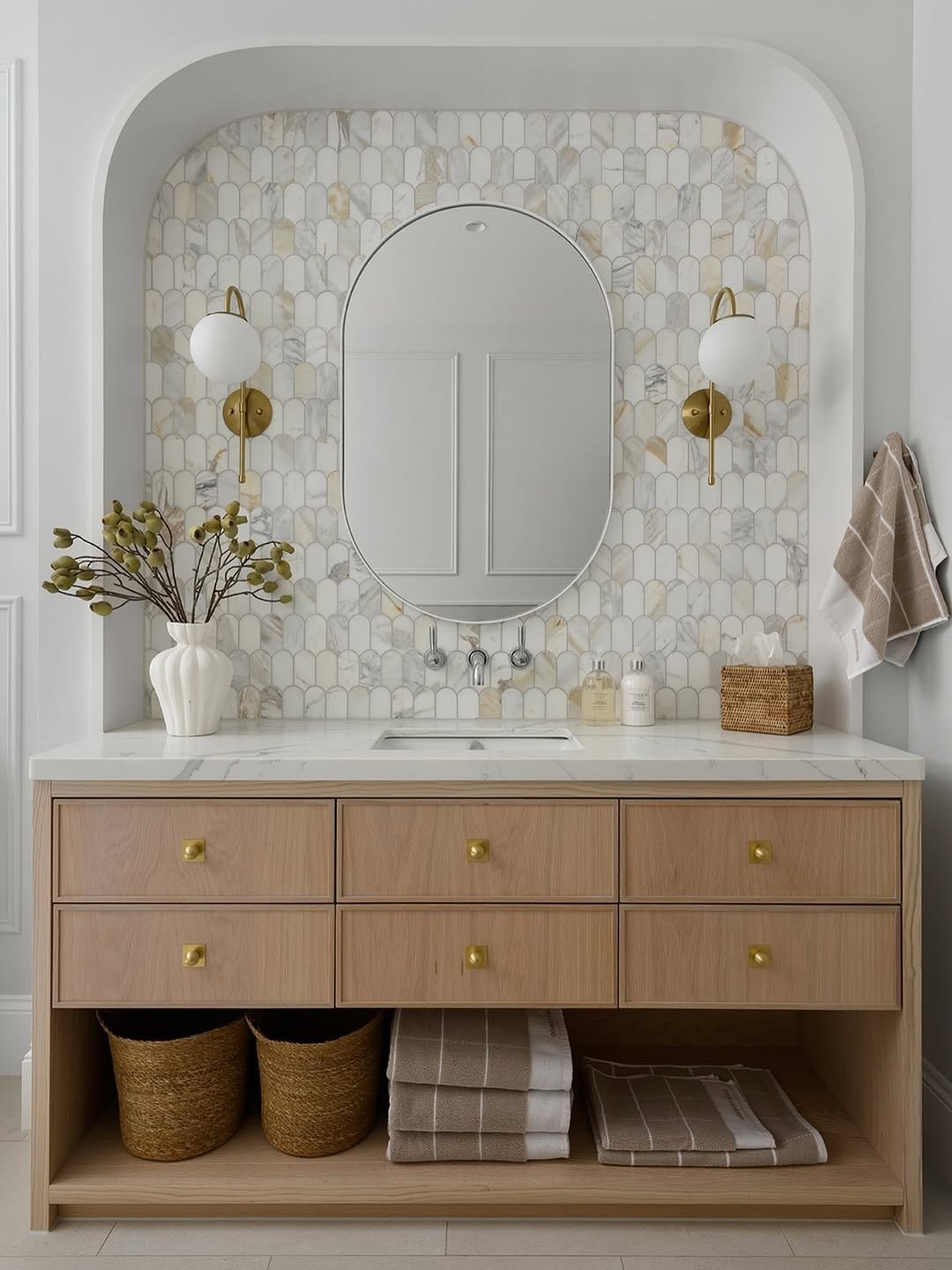 This vanity is all about curves and softness. The arched niche, rounded mirror, and delicate tile pattern create a look that feels almost sculptural.