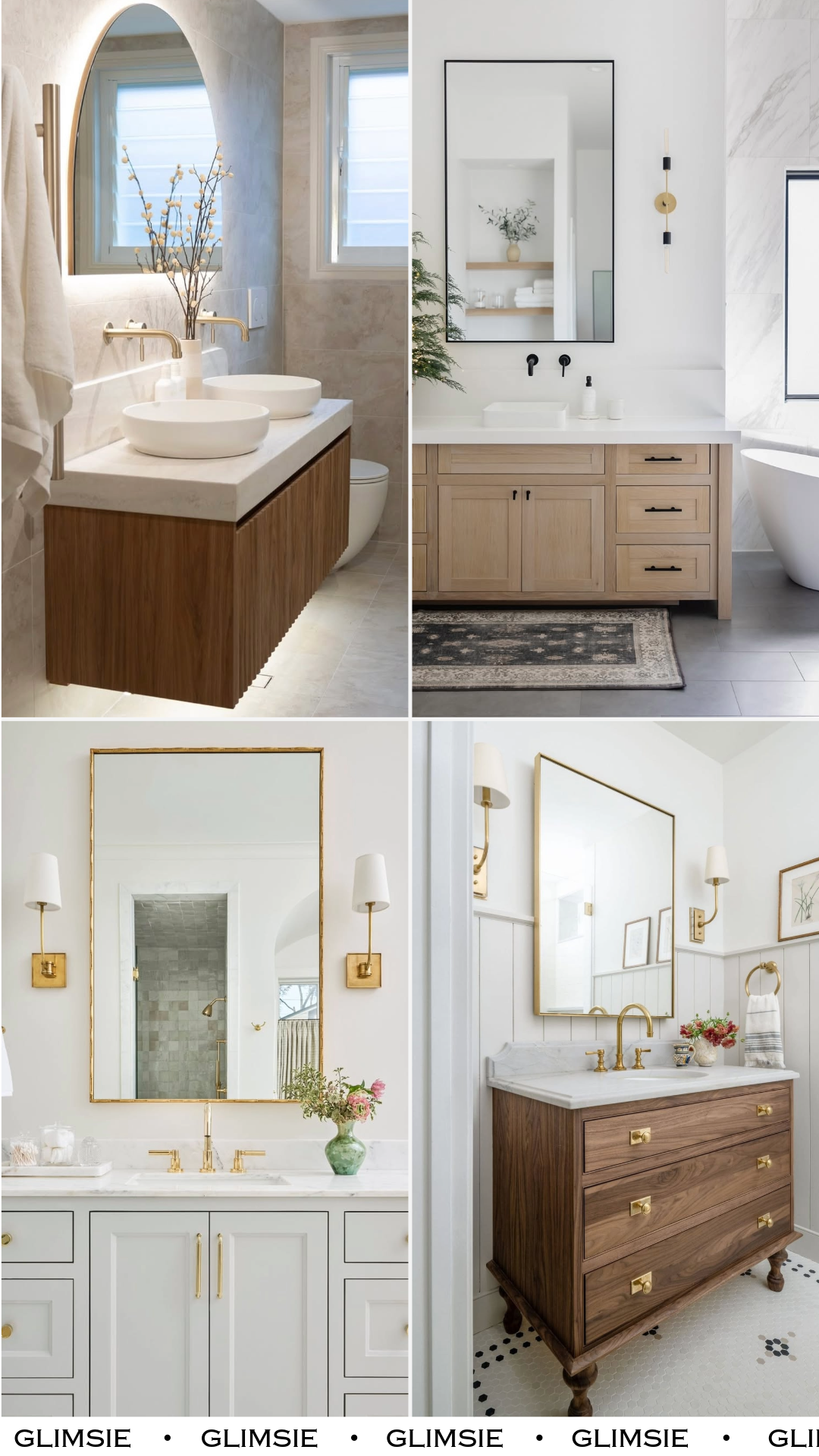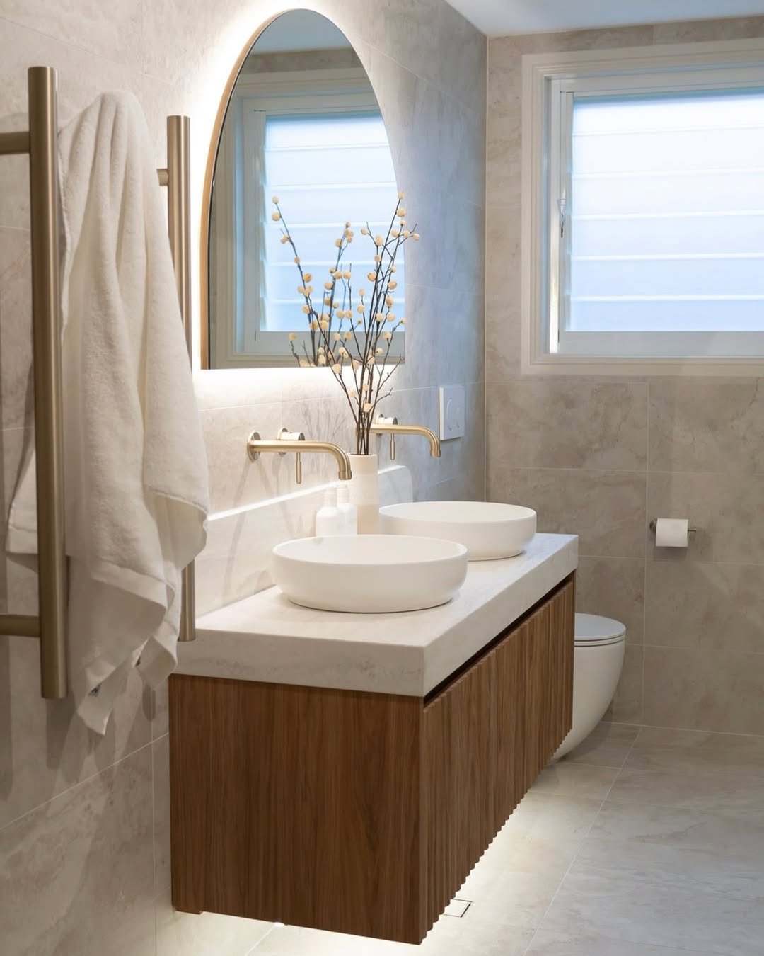 Okay, this vanity is a moment. The fluted wood detailing runs across the entire piece, making it feel custom, elevated, and honestly kind of addictive to look at. Pair that with those arched mirrors and warm lighting, and you’ve got instant wow factor.