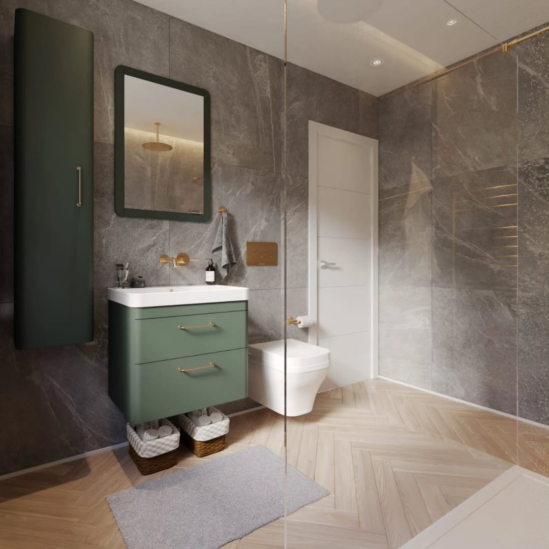There’s something undeniably charming about this one. The muted green vanity paired with warm brass hardware feels soft, elegant, and just a little bit romantic.