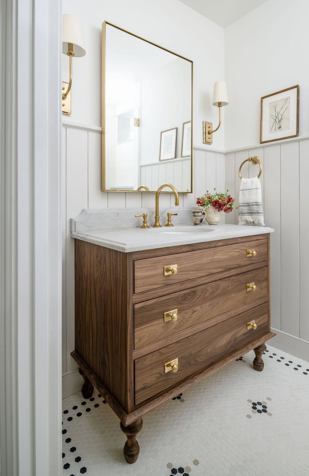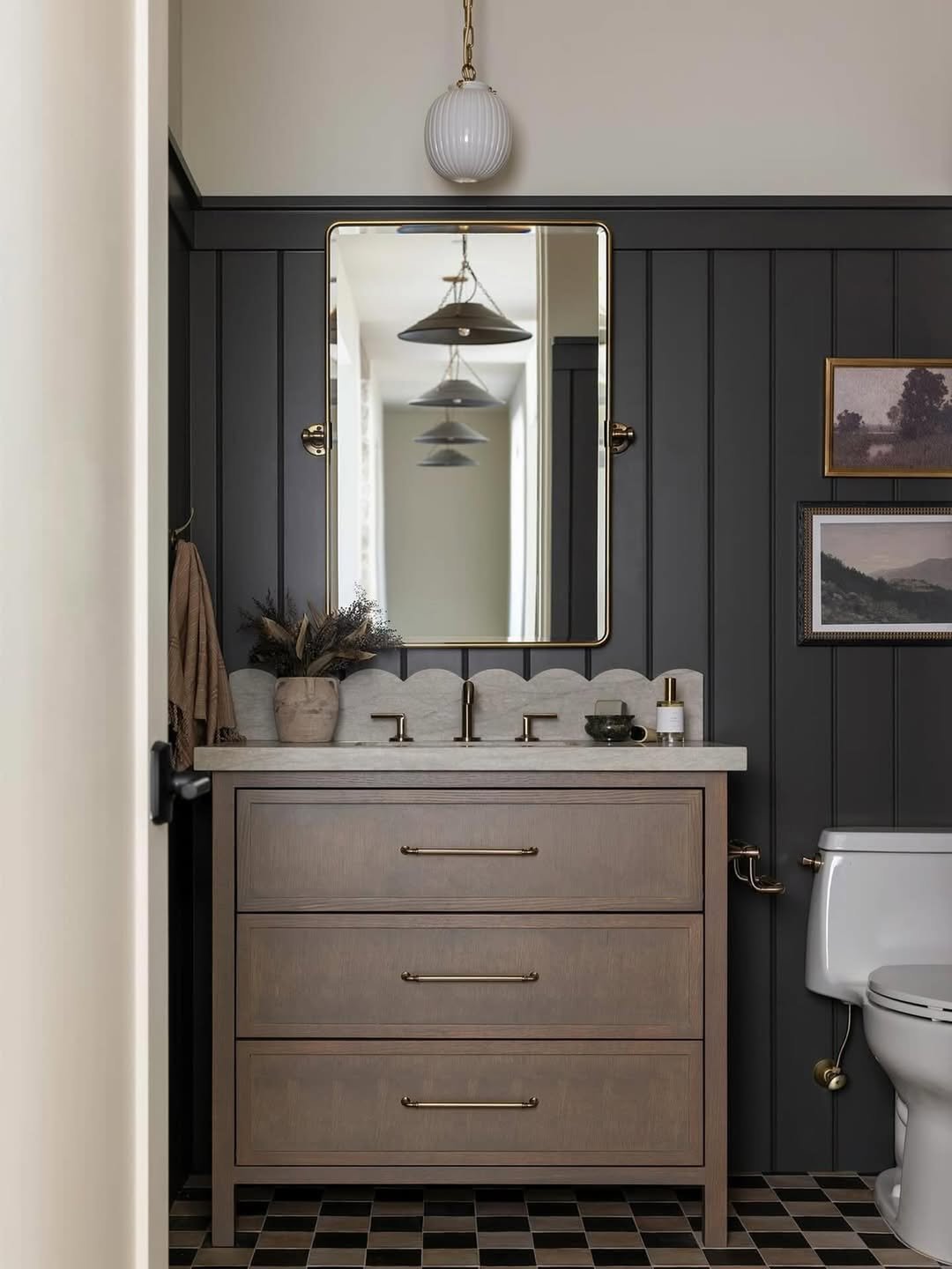 This one leans into drama—and honestly, it pays off. The dark paneled walls create such a rich backdrop, making that warm wood vanity and brass details pop even more. It feels a little vintage, a little tailored, and very put-together without feeling stiff.