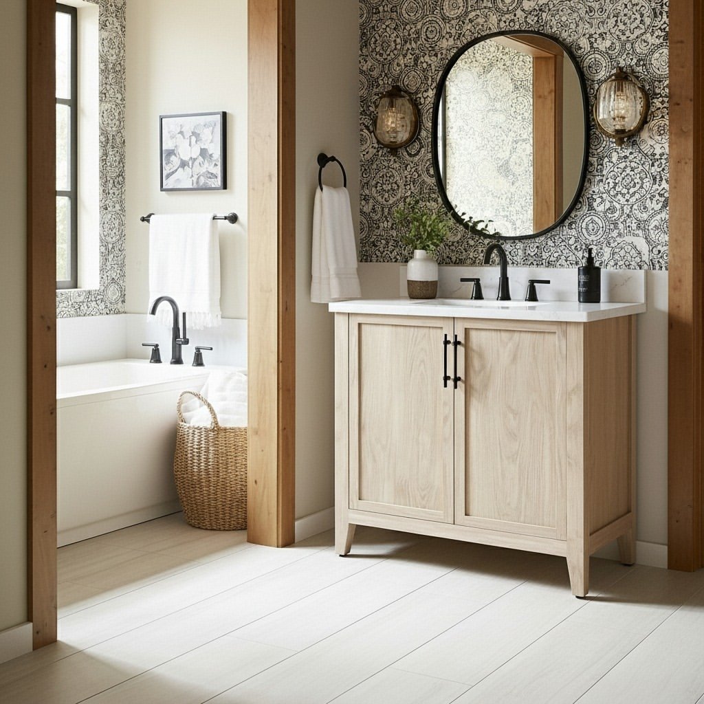 This vanity keeps things simple up front, but then surprises you with that bold patterned wall behind. It’s a perfect example of how you can let one element do the talking while everything else supports it.