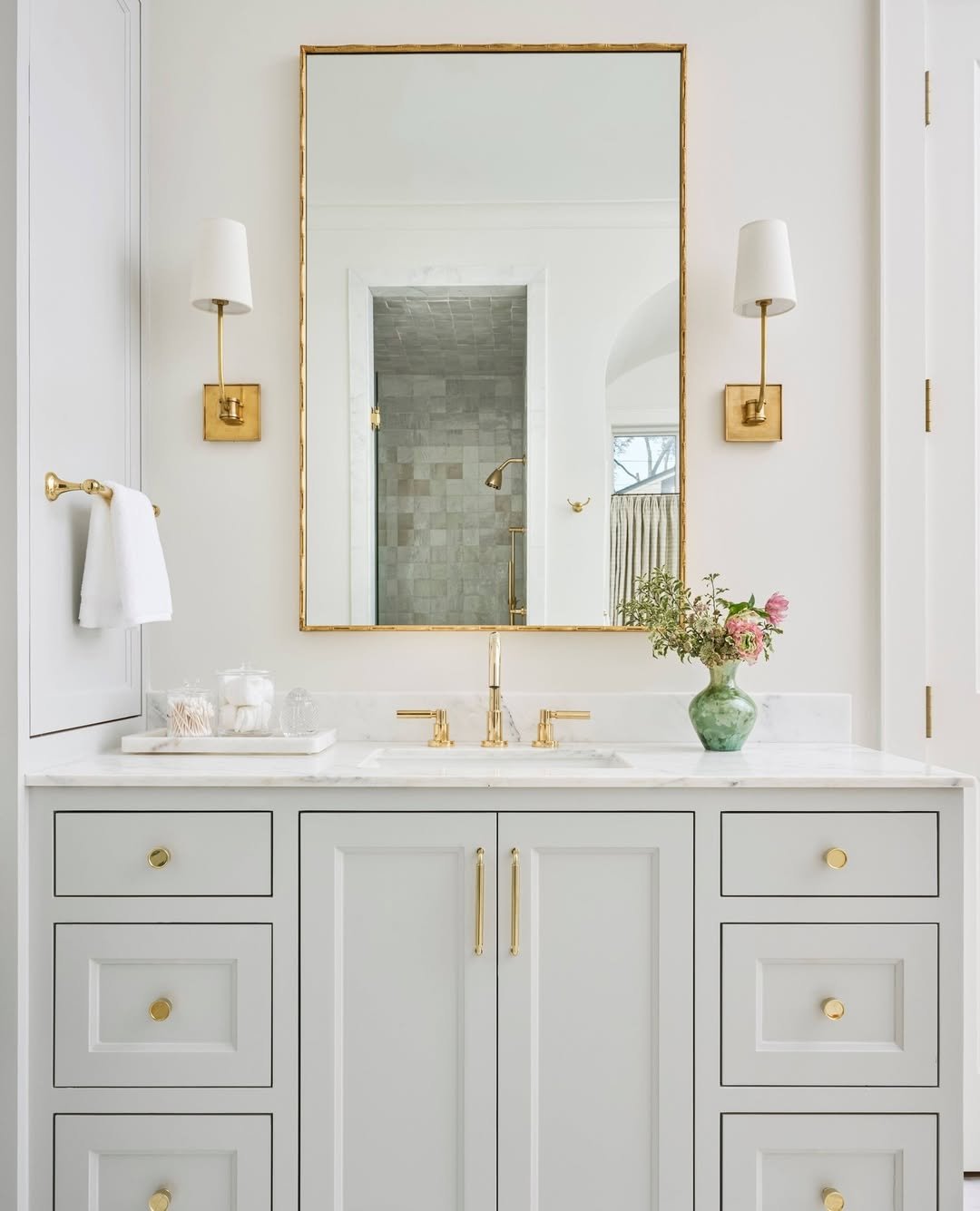 Now this is timeless with a capital T. The soft gray vanity paired with warm gold hardware feels classic, but not dated. It’s the kind of look that will still feel relevant years from now—always a win.