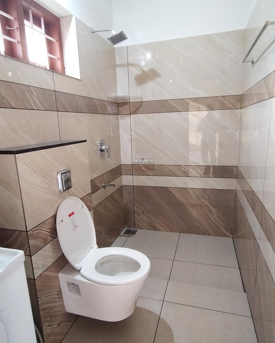 This space feels like home—in the best way. The gentle wall tiles keep things light and simple, while the patterned flooring adds that cozy, lived-in charm.