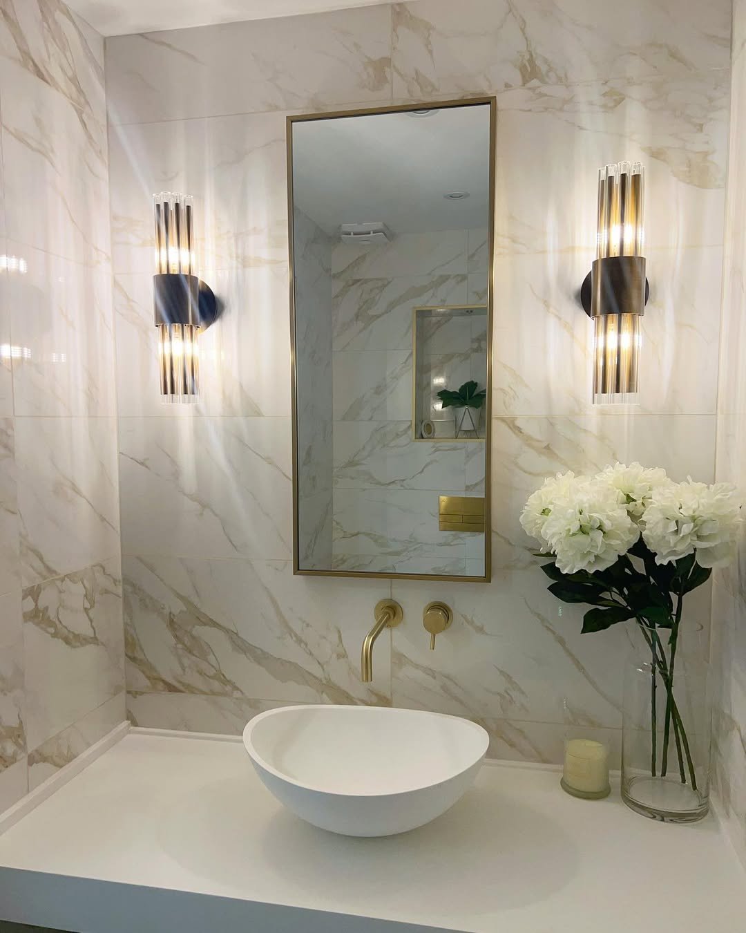 This is marble, but make it glam. The soft veining mixed with warm gold fixtures creates a look that feels both elegant and slightly dramatic.