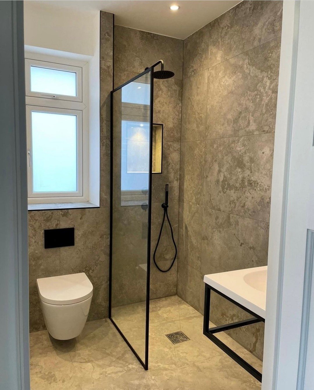 Now this one leans a little moodier. The textured stone tiles bring in that raw, industrial vibe that feels bold without being overwhelming.