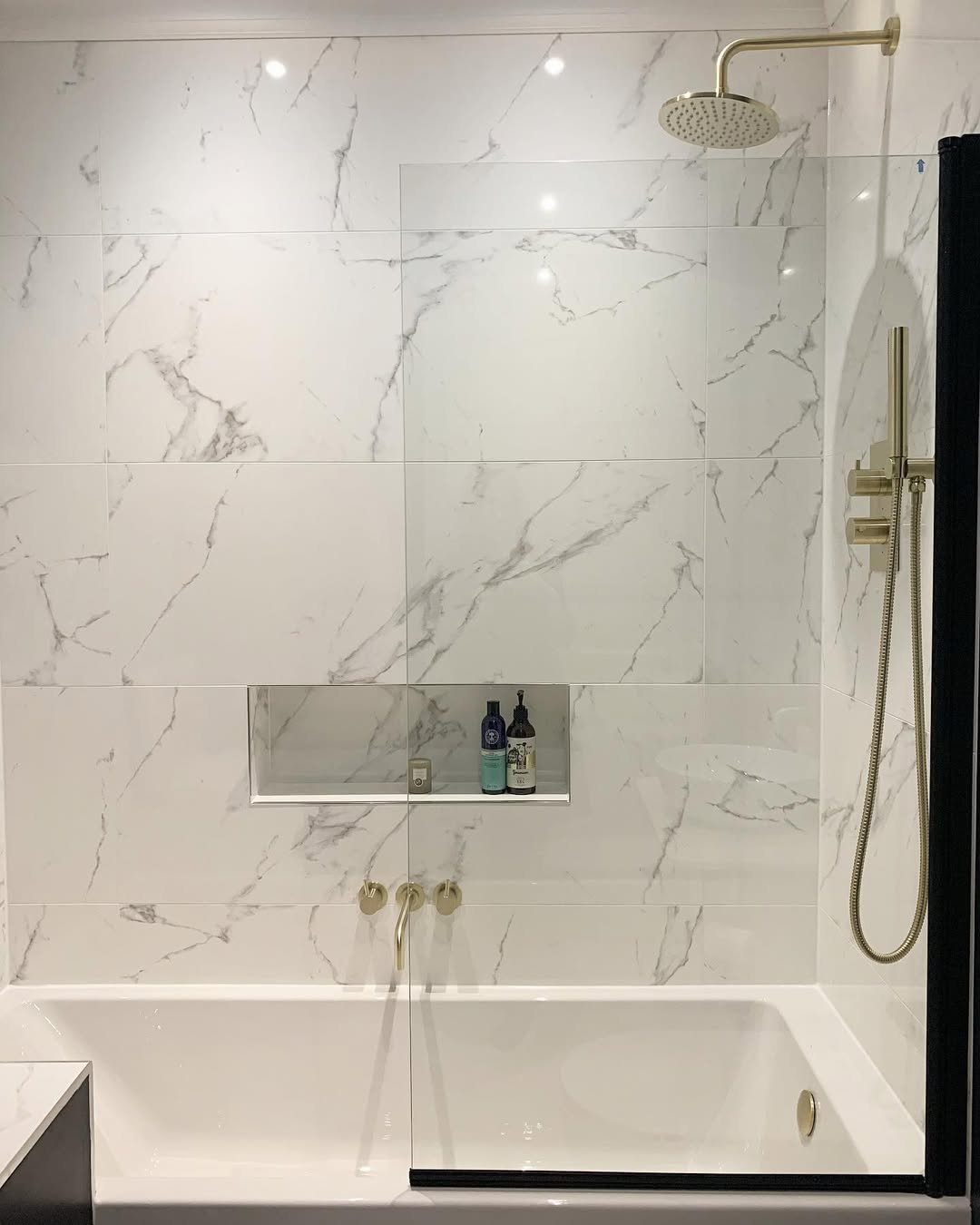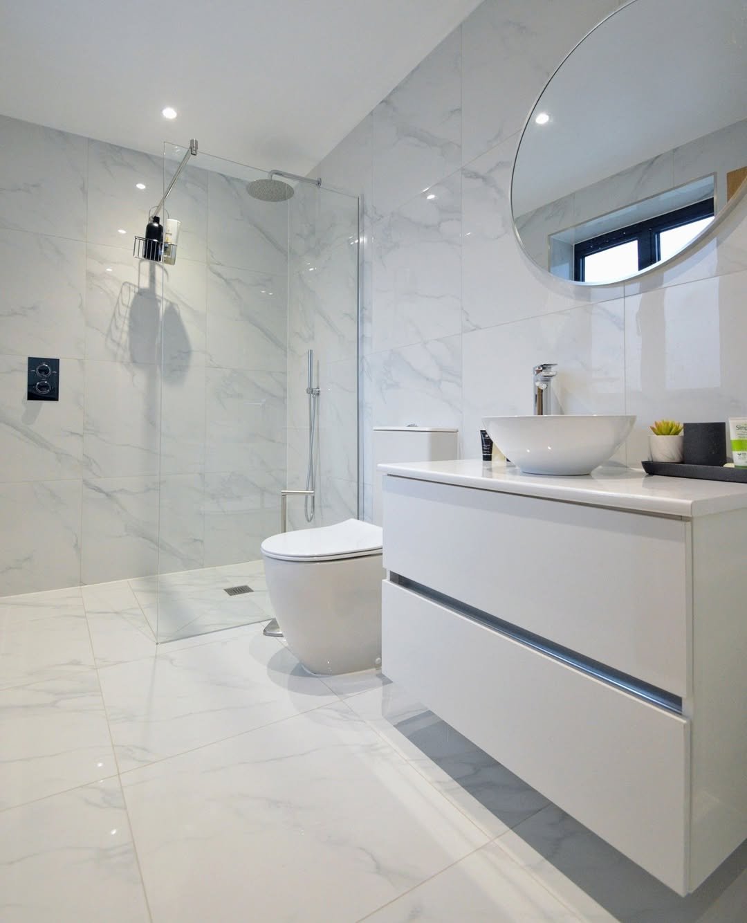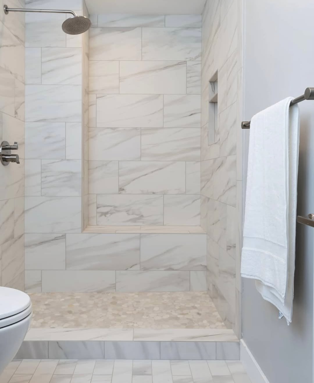 This one is smooth, sleek, and seriously satisfying to look at. The large-format marble tiles create that almost seamless effect—barely any grout lines, just clean flow from wall to floor.