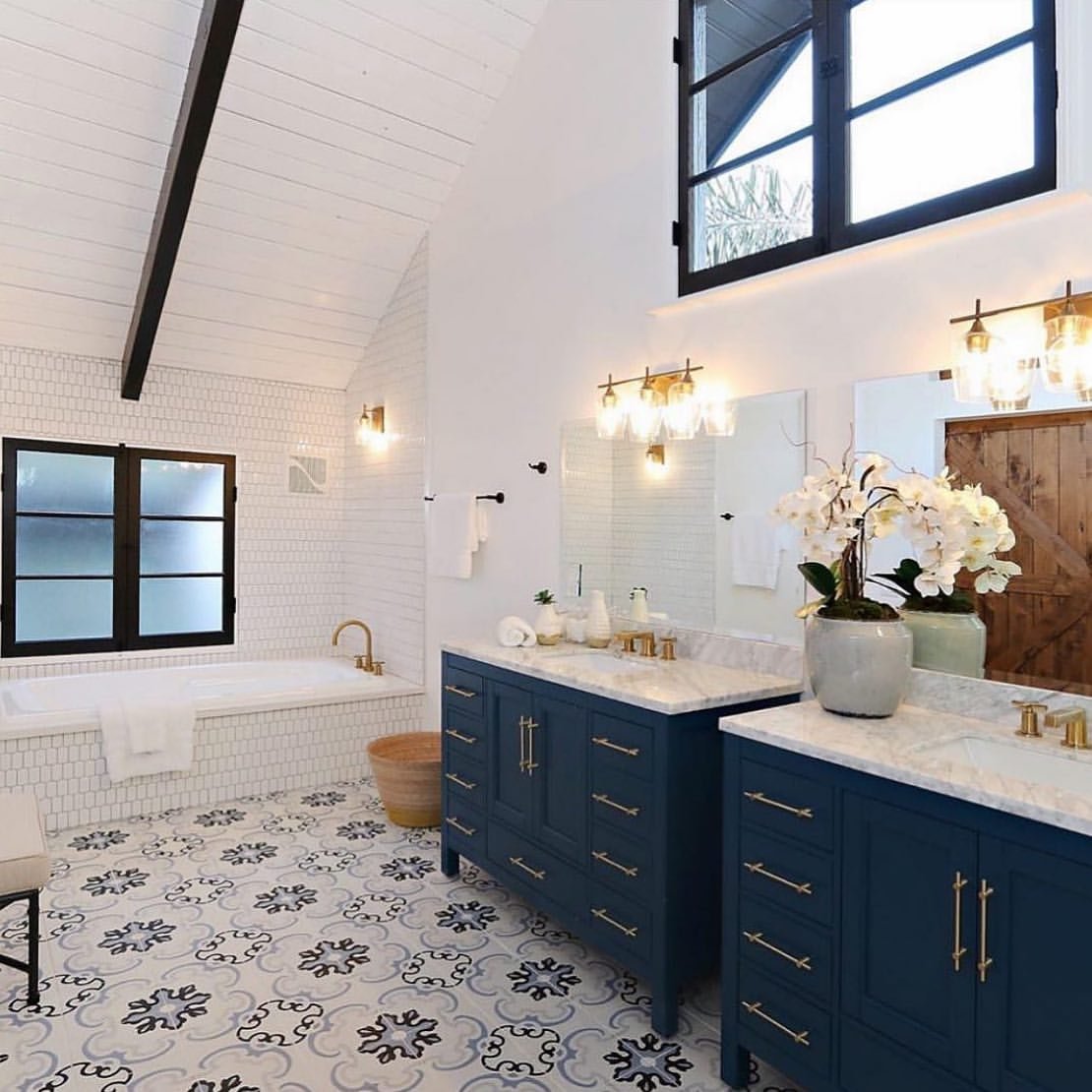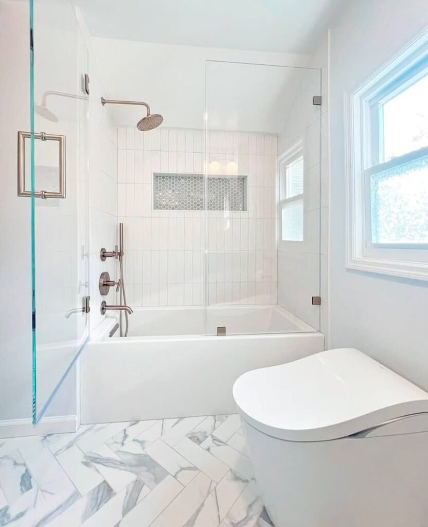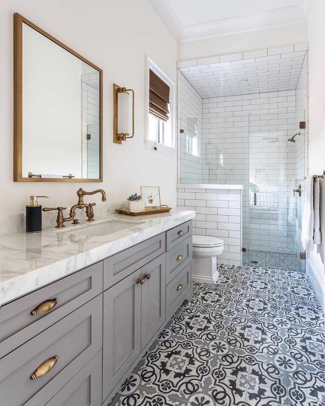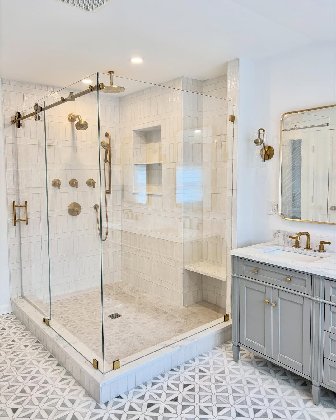 And paired with those warm fixtures? It hits that sweet spot between modern and luxe. Definitely one of those “this bathroom looks expensive” moments.