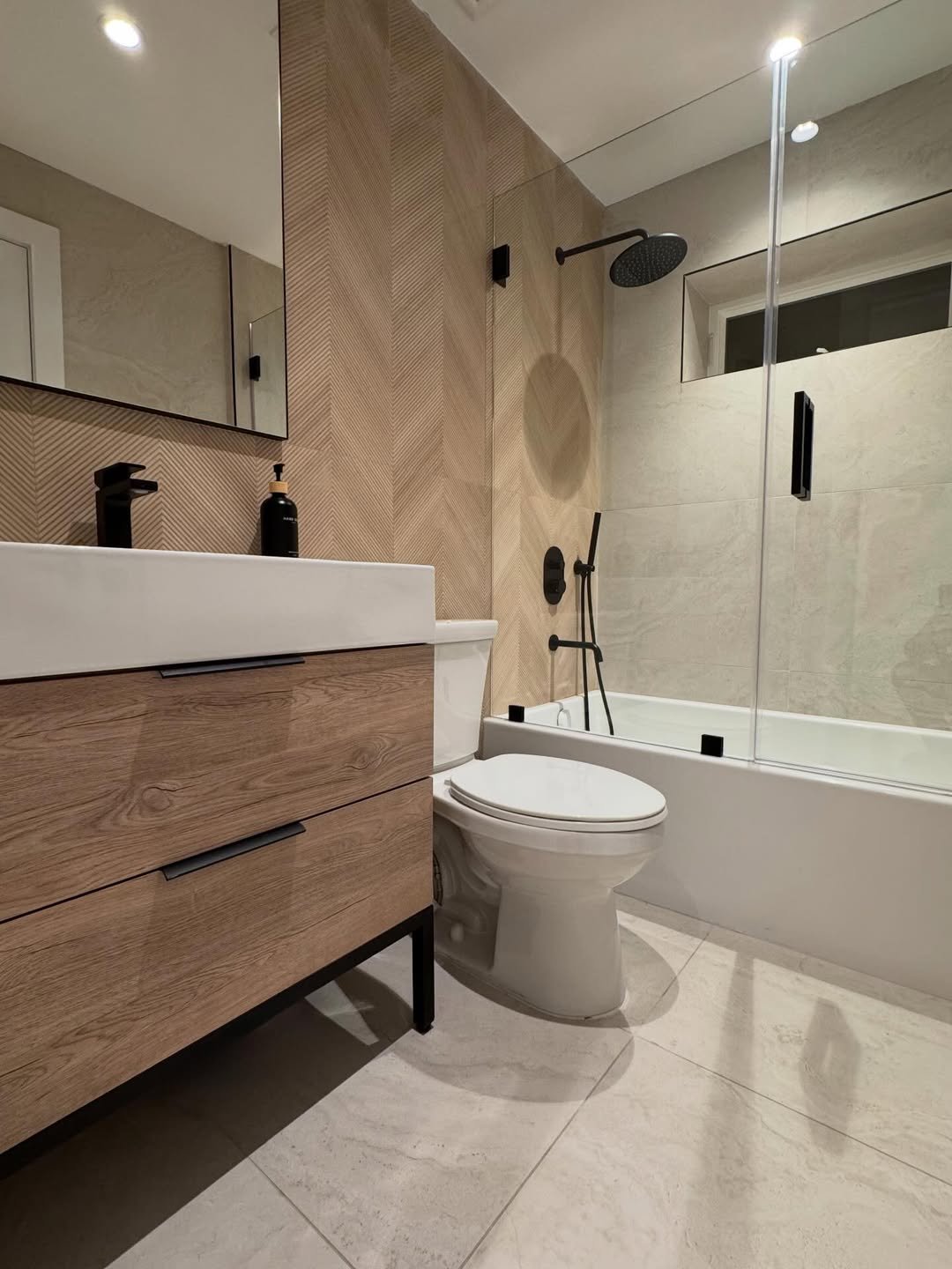 Add in the soft neutral tones and warm wood, and you’ve got a bathroom that feels calm, modern, and just really easy to live with.