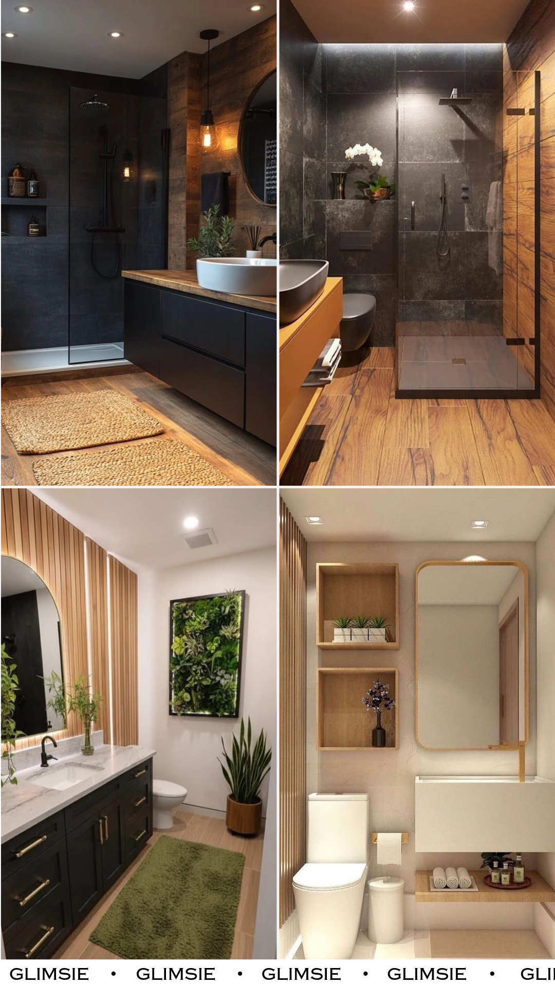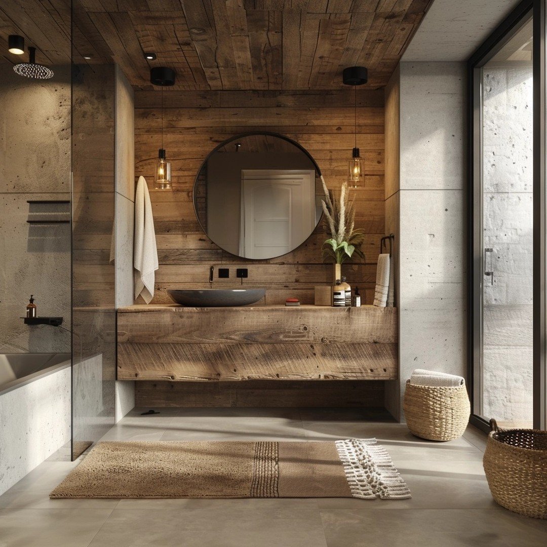 This one leans bold with heavier wood textures, and honestly, it works. The chunky wood vanity and wall bring in that grounded, almost cabin-like feel.