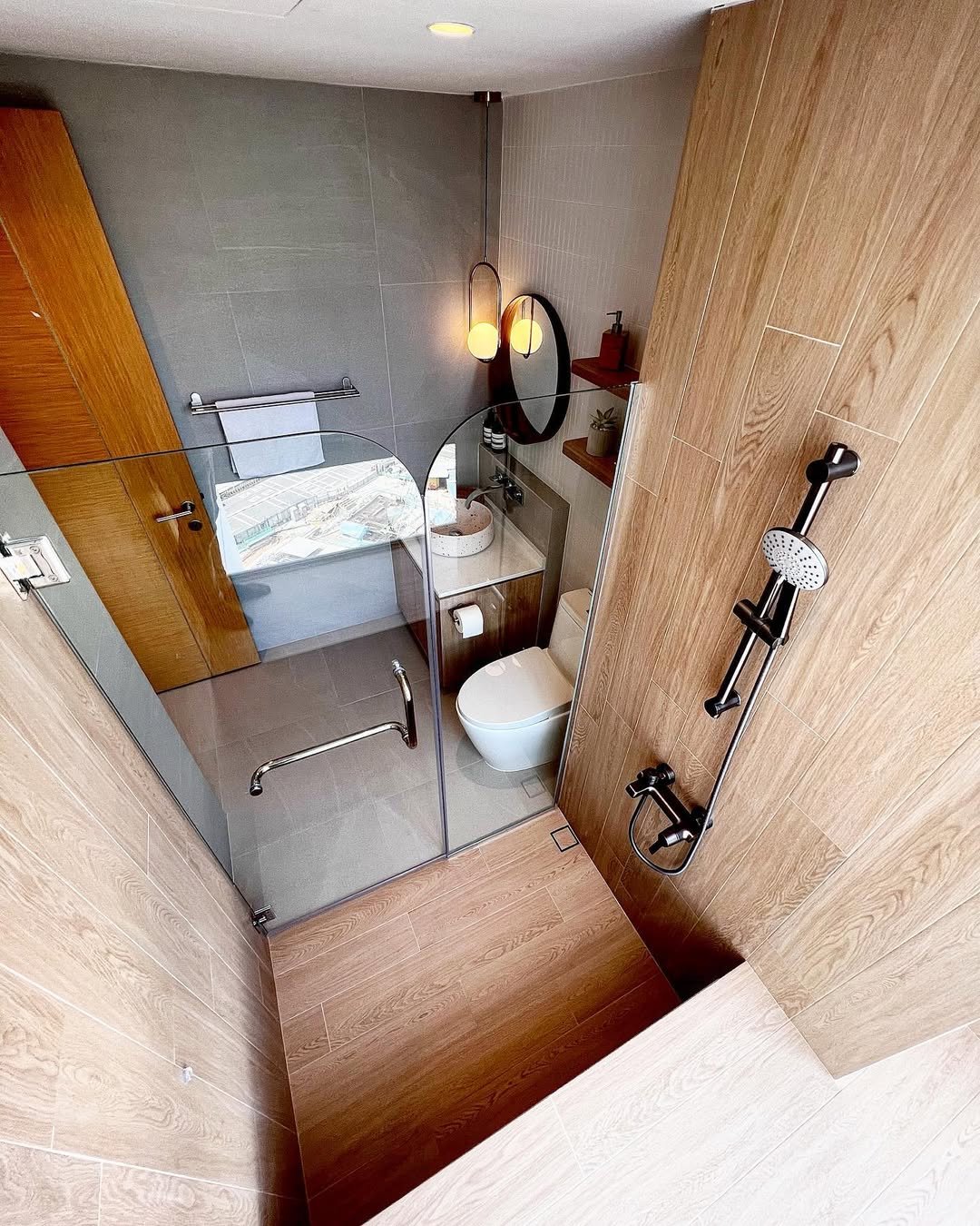 This layout is doing a lot with a little. The wood-look tiles wrap the shower area so seamlessly, it almost feels like one continuous space.
