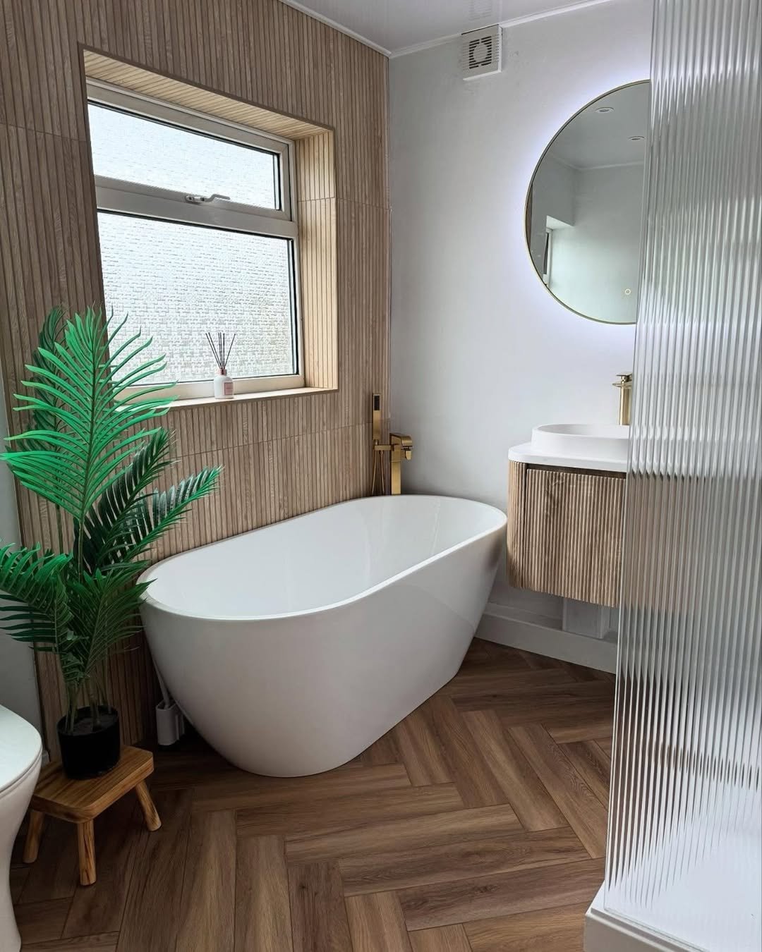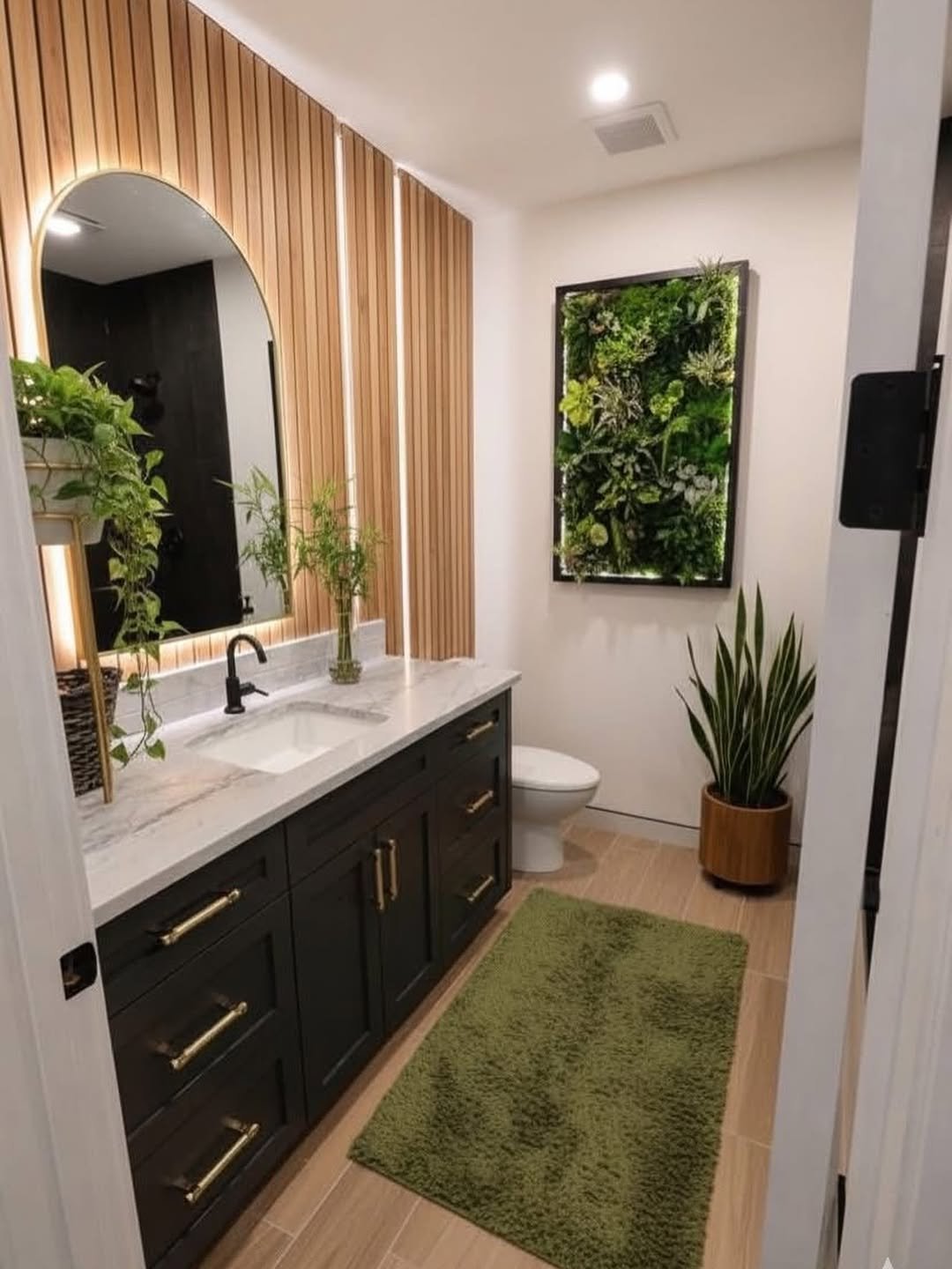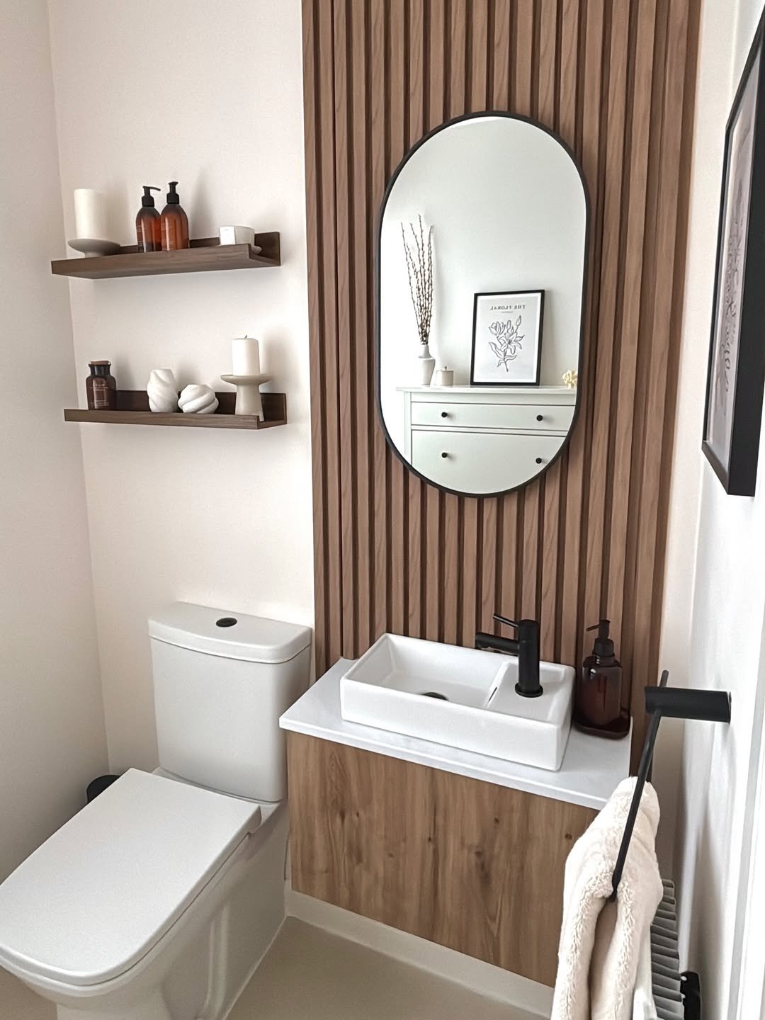 That vertical wood slat wall? Instant texture upgrade. It draws your eye up and makes the whole bathroom feel taller and more styled.