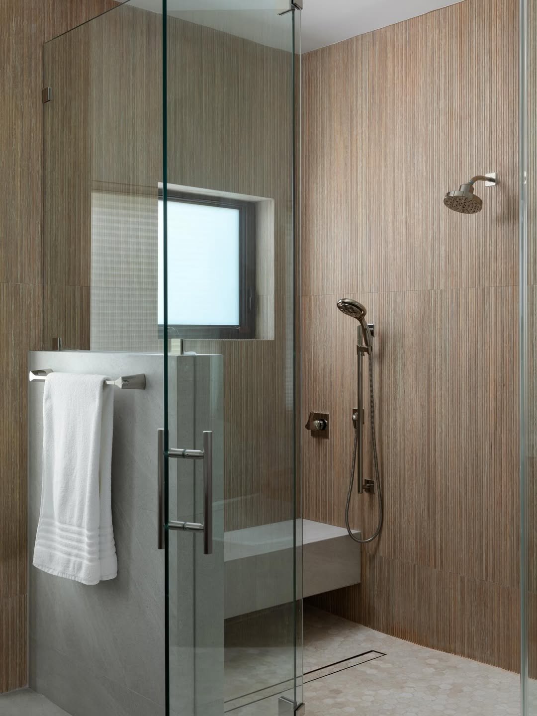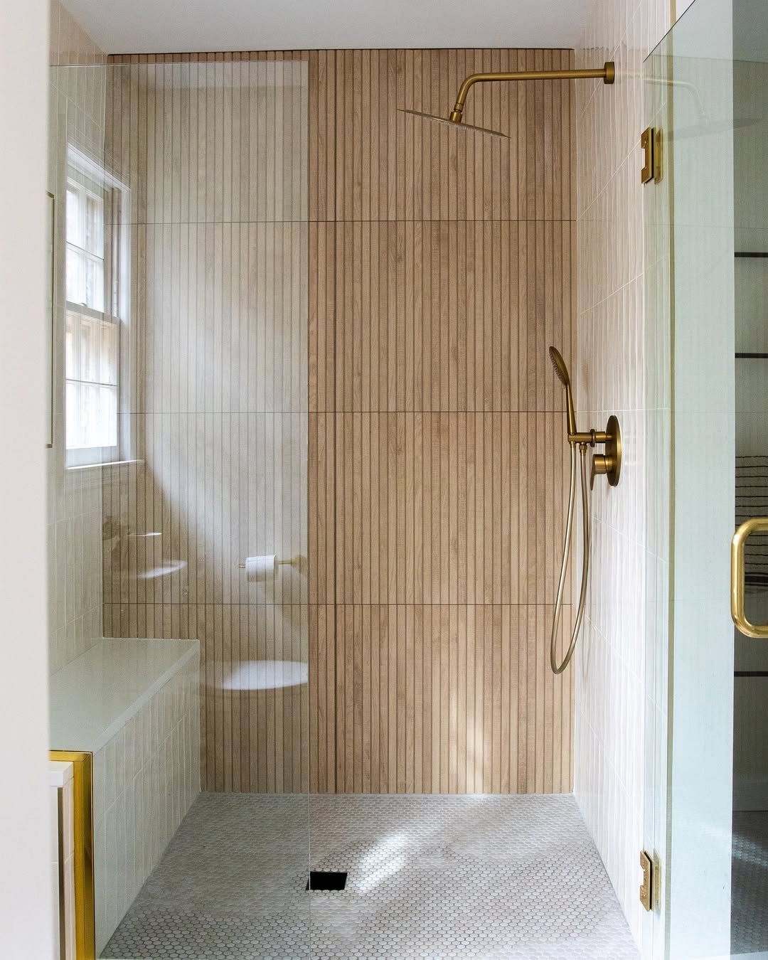 This one is all about subtle texture. The vertical wood slats bring just enough movement to the space, without overpowering that clean, spa-like feel.