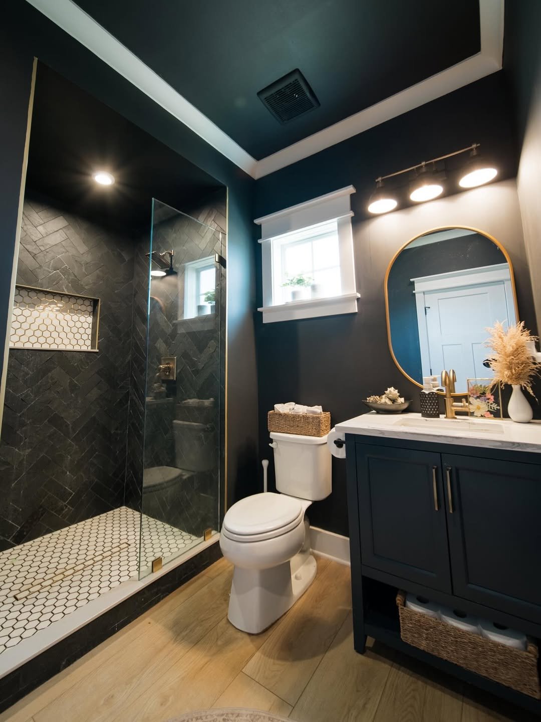 Dark walls, warm wood flooring, and that sleek vanity—this space leans bold without going overboard. The wood tones break up the darkness perfectly.