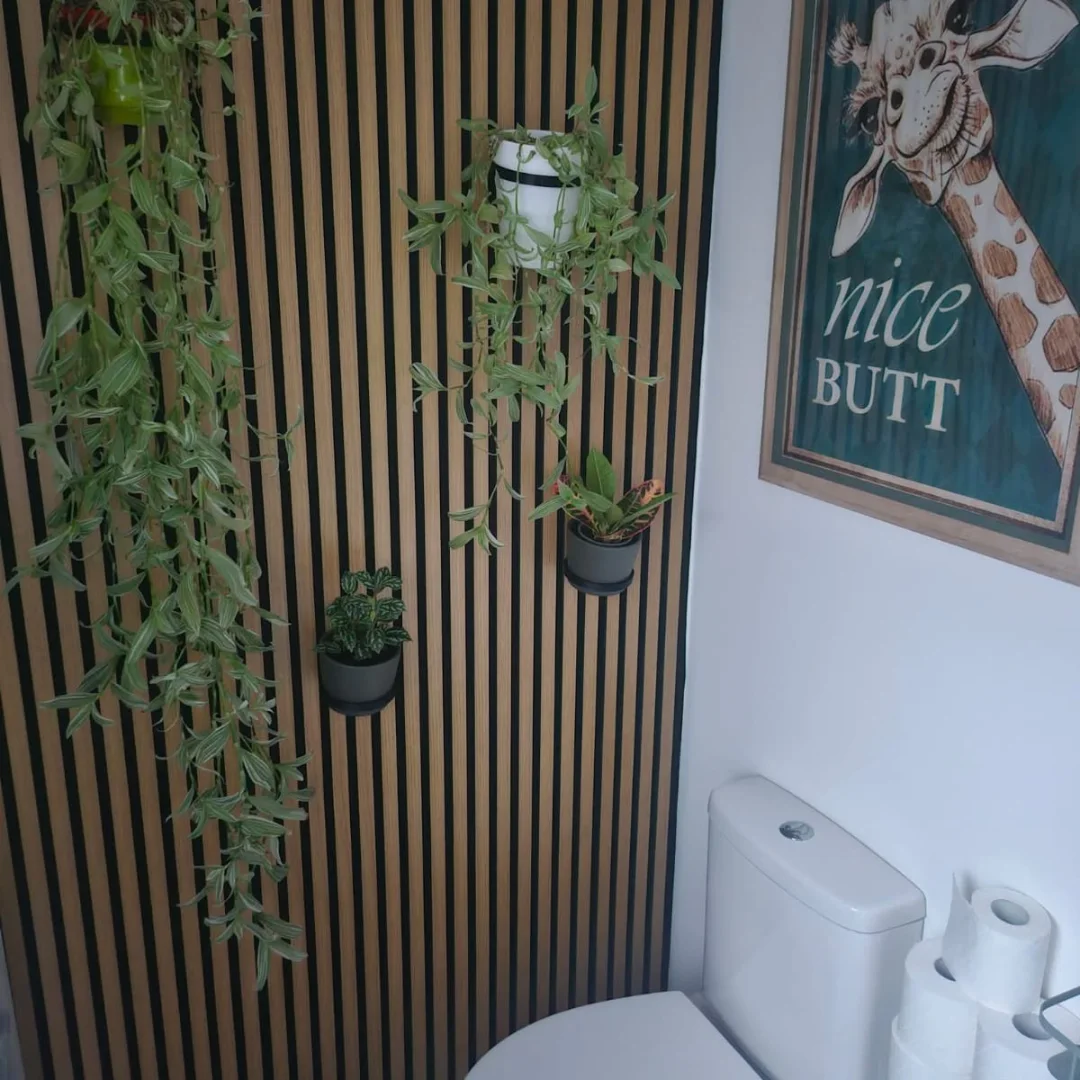 This one feels fresh and alive. The wood slat wall adds texture, while the greenery brings that natural, almost outdoor vibe inside.