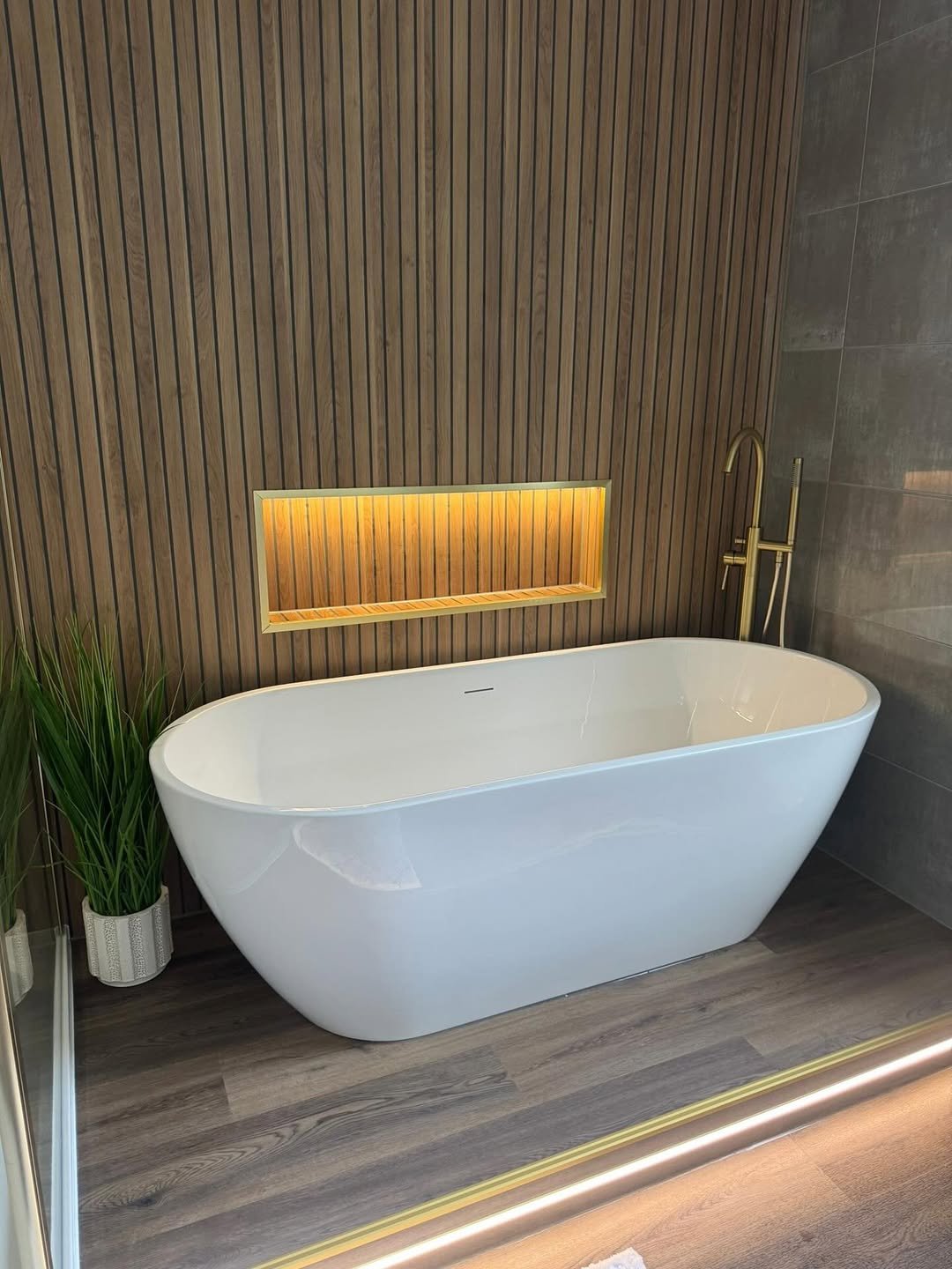 This setup feels like a Sunday reset waiting to happen. The wood accents around the tub create a warm, cocoon-like vibe that makes the whole space feel softer.