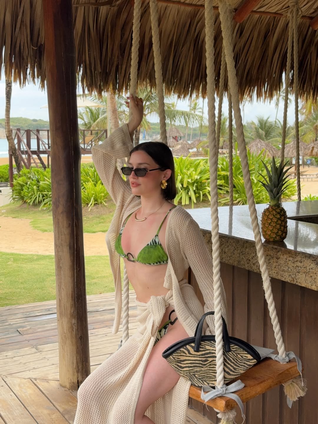 A green bikini layered under a loose knit cover-up feels relaxed in the best way. The textures do all the work, soft, open weave against smooth swim fabric.