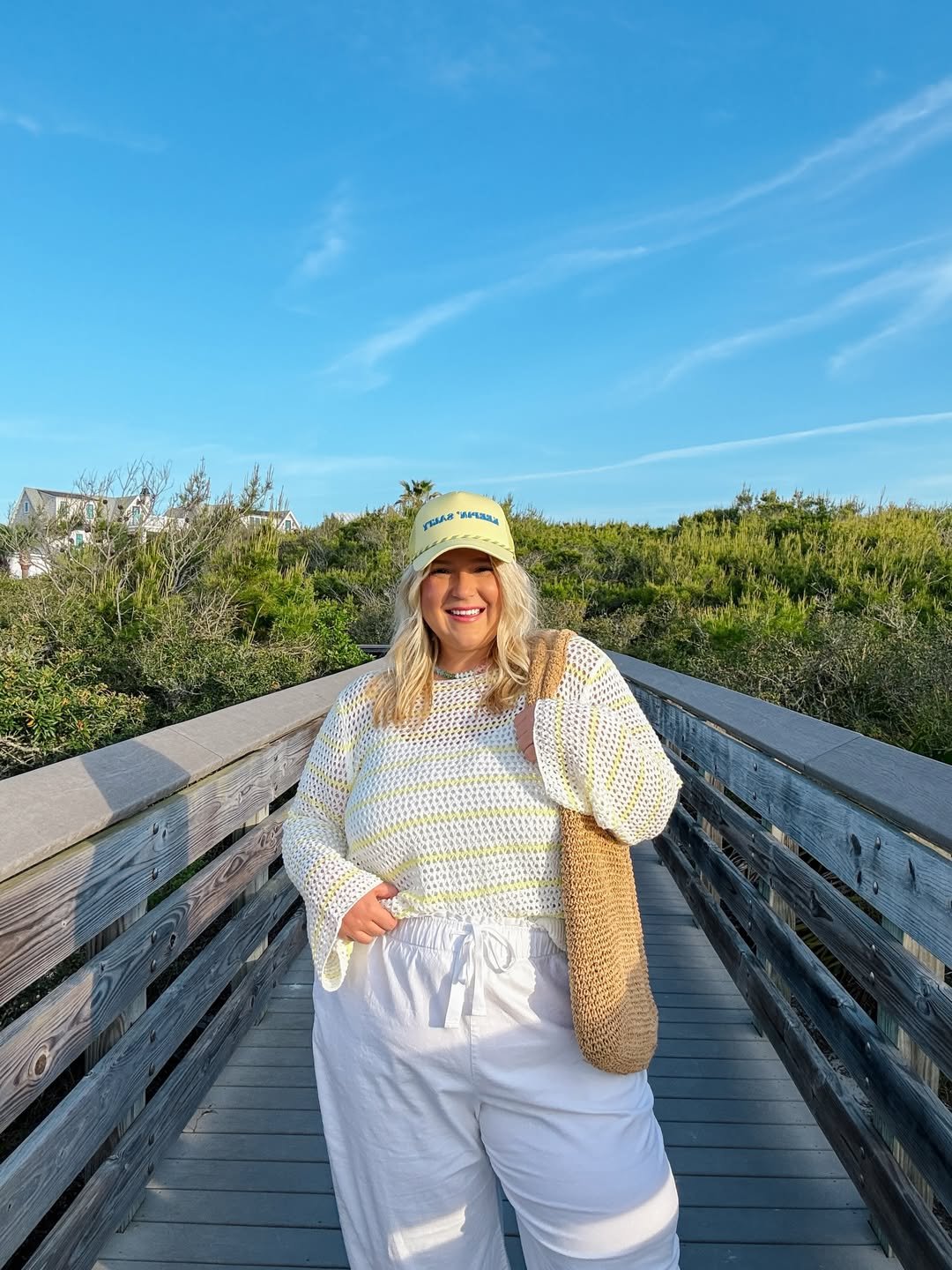 A loose, open-knit sweater layered over crisp white drawstring pants creates that easy, coastal morning look. The soft stripes and relaxed fit feel like a deep breath after a long week.