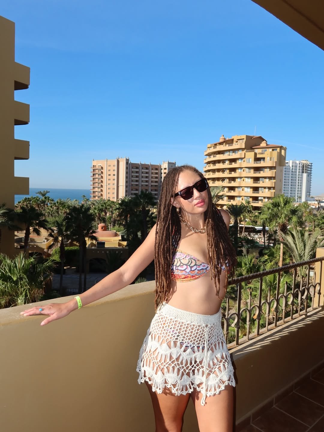 A textured crochet skirt layered over a printed bikini top instantly brings in that beachside nostalgia. There’s a handcrafted feel to it, like something picked up from a tiny coastal market.