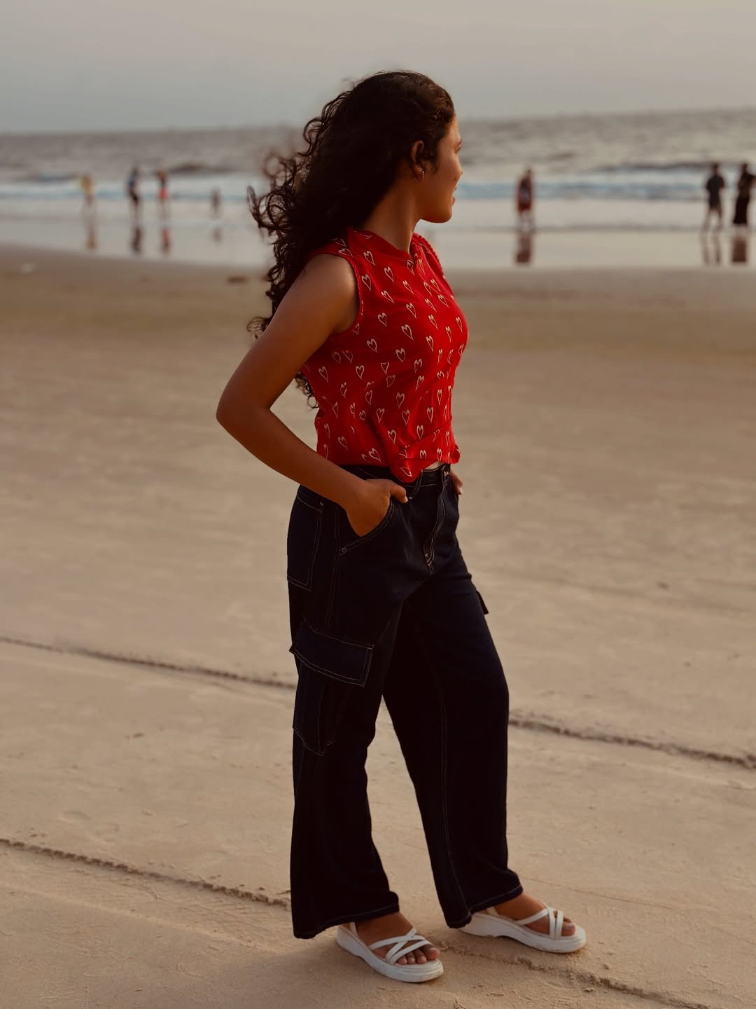 A red printed top paired with relaxed black trousers brings a grounded, everyday feel to the beach. It’s less about swimming, more about slow walks and salty air.