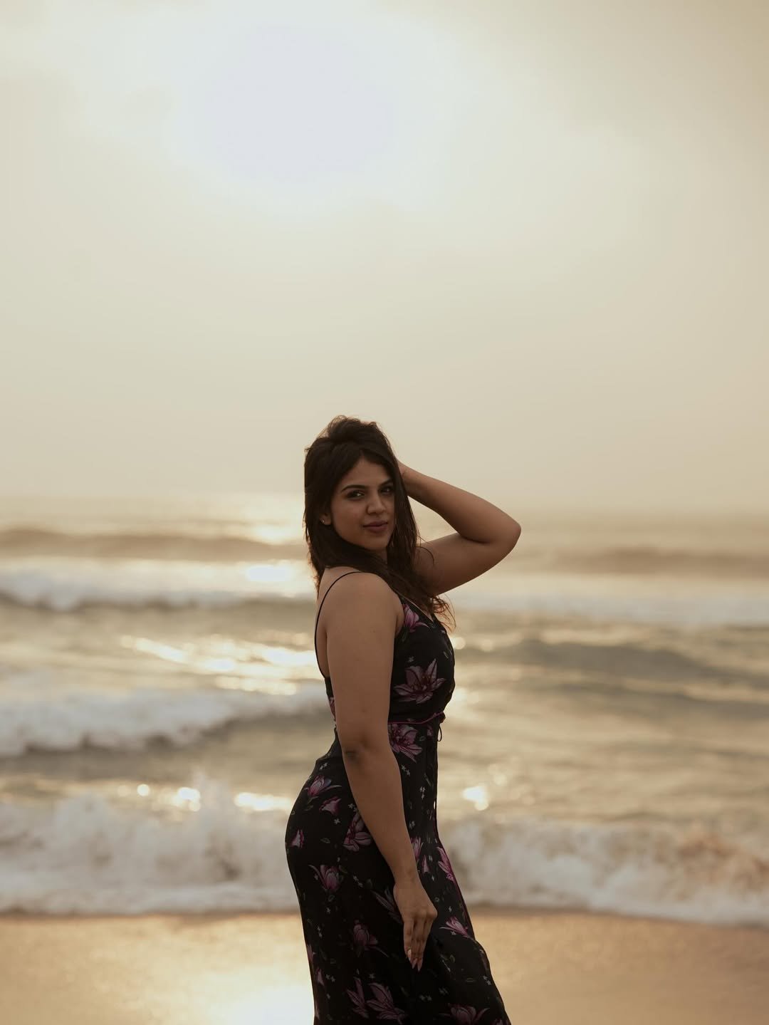 A dark floral slip dress against a glowing sunset feels quietly romantic. The silhouette skims the body, while the print adds just enough movement as the light shifts.