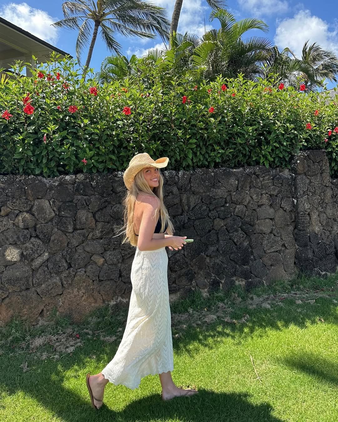 A long white skirt with a simple bikini top and straw hat feels like pure vacation energy. Light fabrics move with every step, catching bits of sun and shadow as you walk.