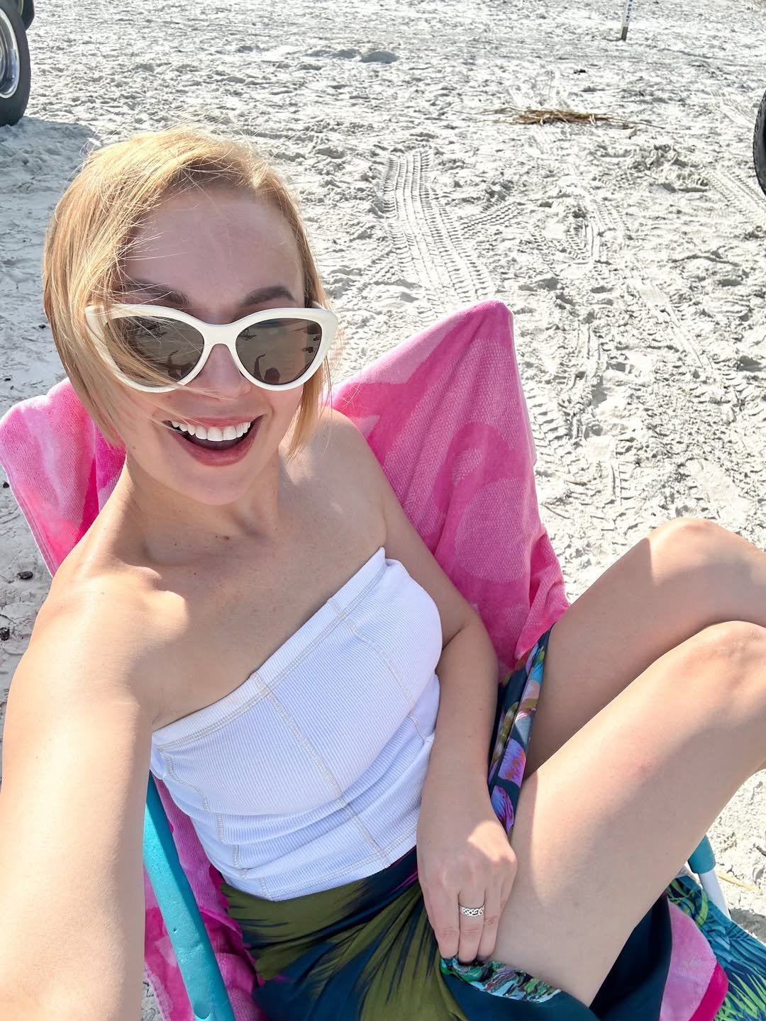 A white bandeau paired with a tropical sarong feels sun-soaked and carefree. The oversized sunglasses add a hint of old-Hollywood energy, but in a way that still feels relaxed.