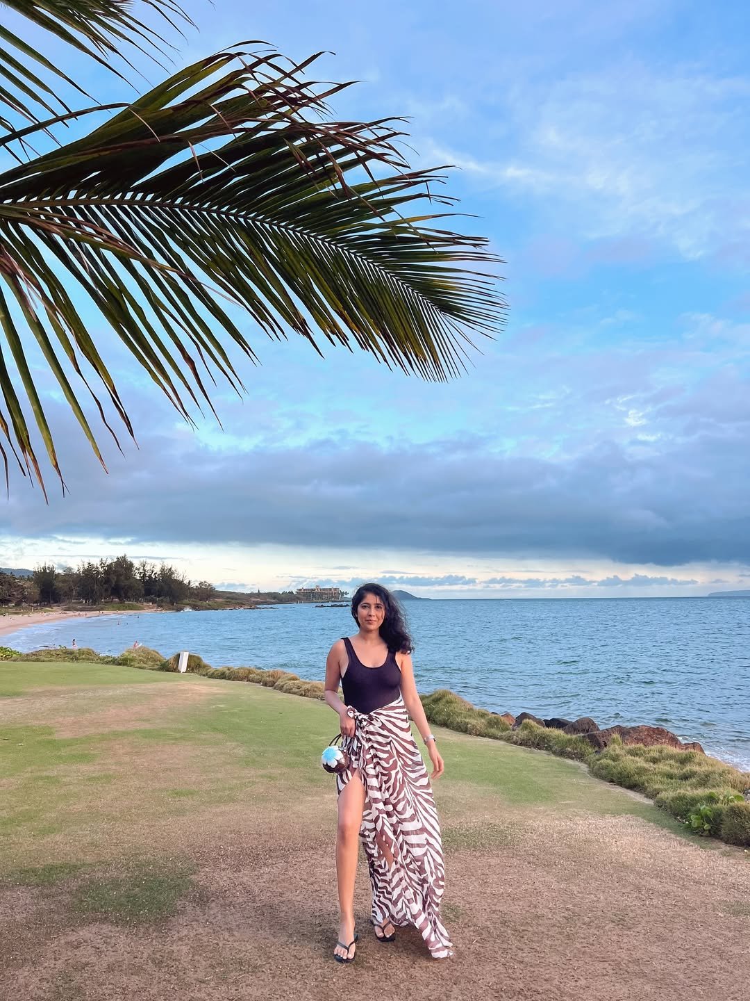 A classic black one-piece paired with a zebra-print sarong creates that perfect mix of bold and relaxed. The high slit adds movement, especially as it catches the breeze near the water.