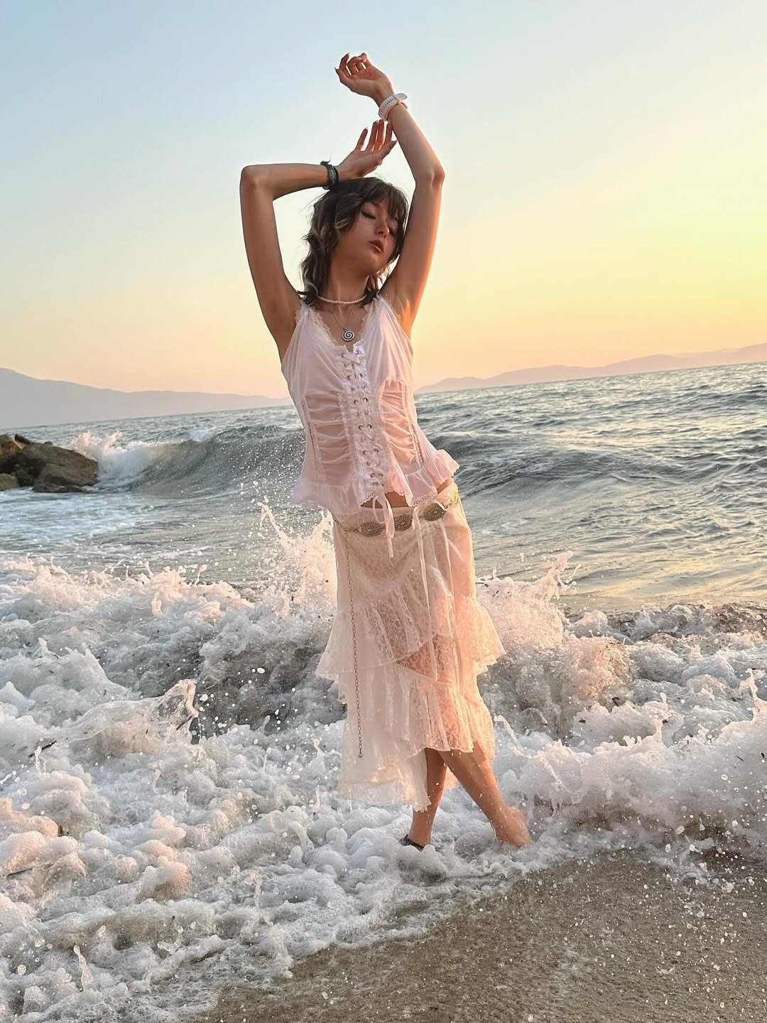 There’s a dreamy quality here, sheer layers, lace-up details, and a silhouette that feels almost weightless against crashing waves. It leans whimsical, but still grounded by the soft neutral palette.