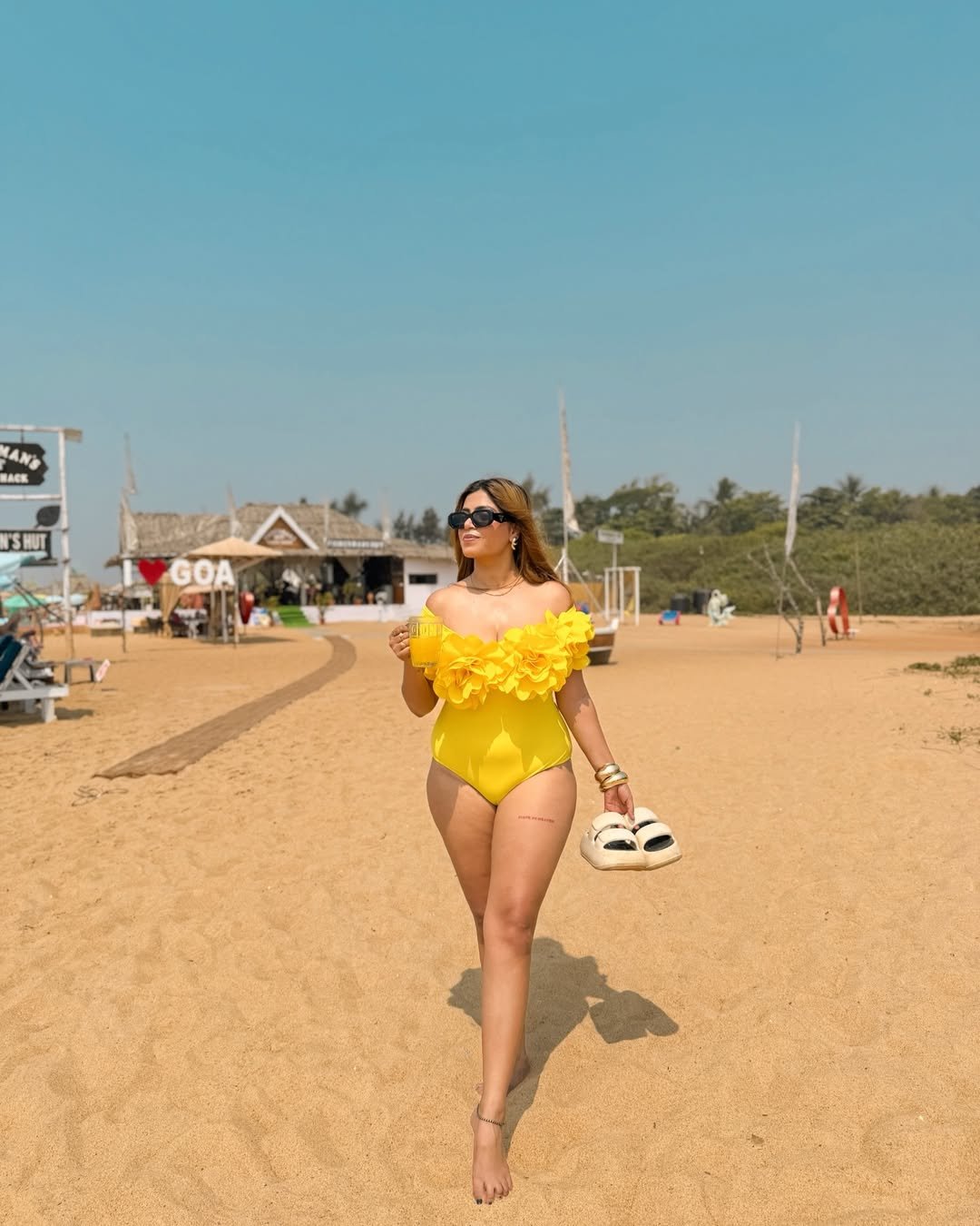 A bold yellow one-piece with oversized floral detailing instantly catches the eye. It feels joyful, like bottled sunshine, especially against warm sand and clear skies.