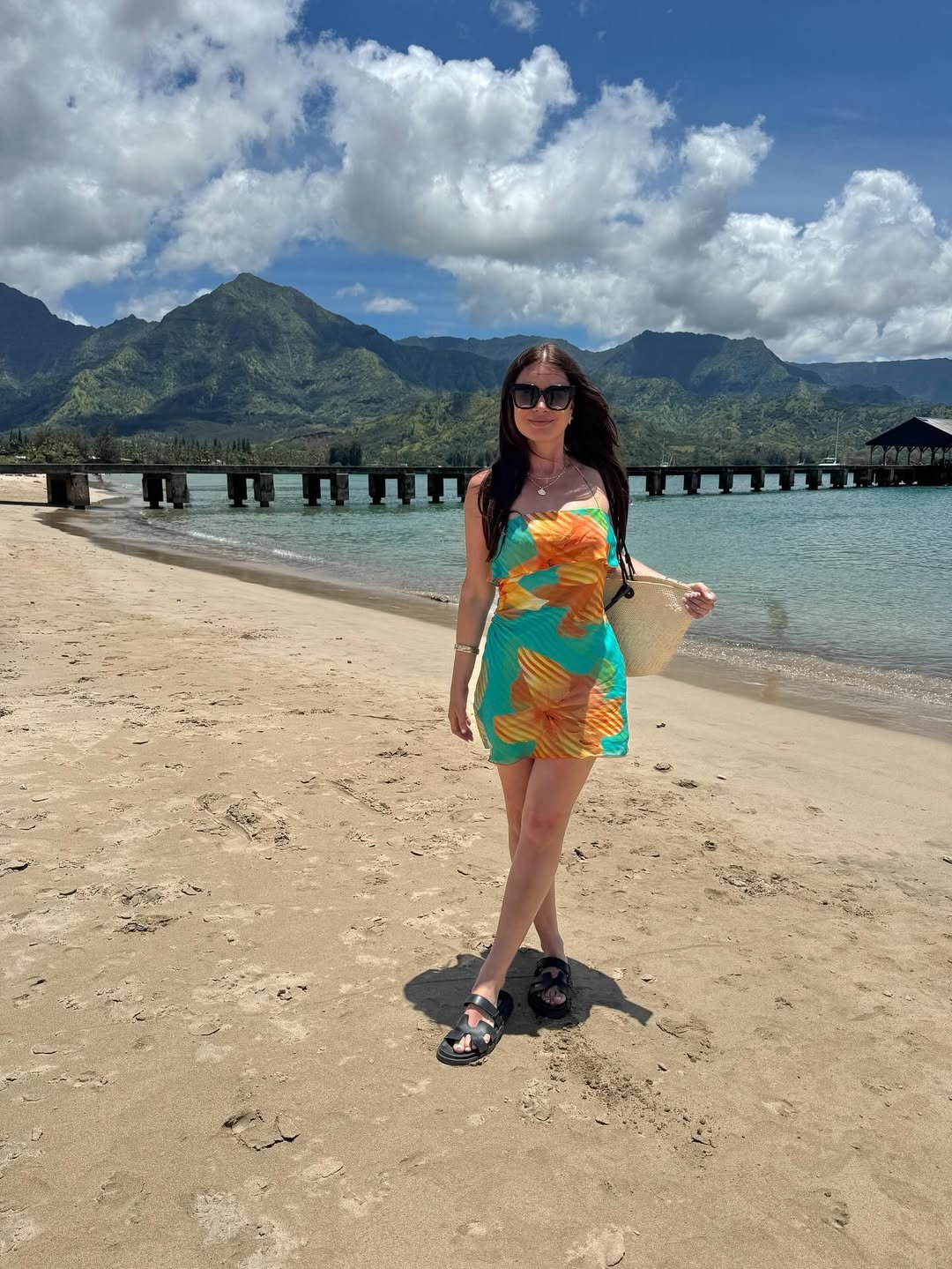 A bright, printed mini dress in saturated greens and oranges brings instant energy to the shoreline. It feels playful, like a quick change after a swim that somehow turns into a full look.