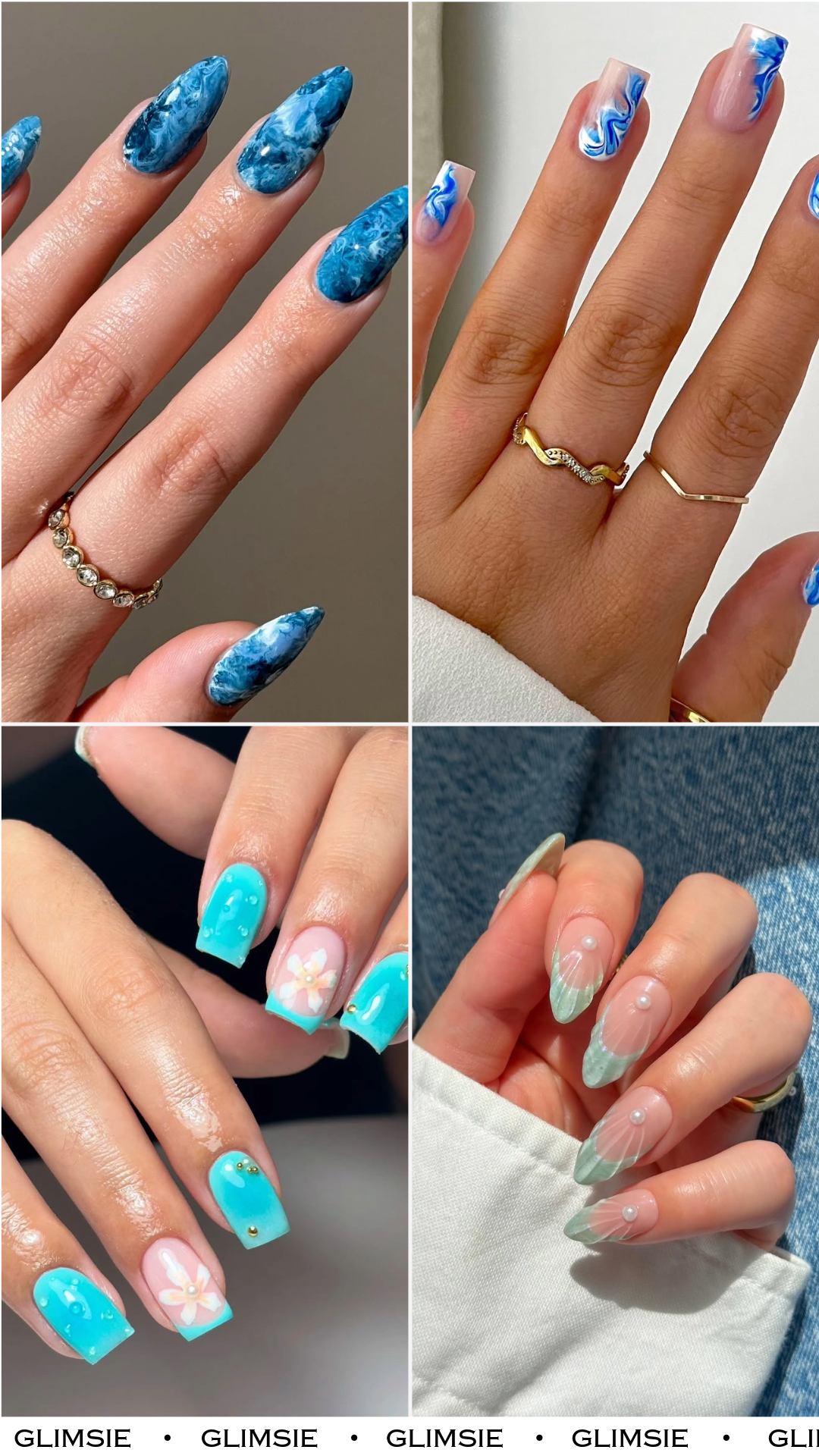 These nails take the French tip and give it a beach-inspired makeover. The soft blue marbled tips resemble tiny ocean waves rolling gently onto the shore.