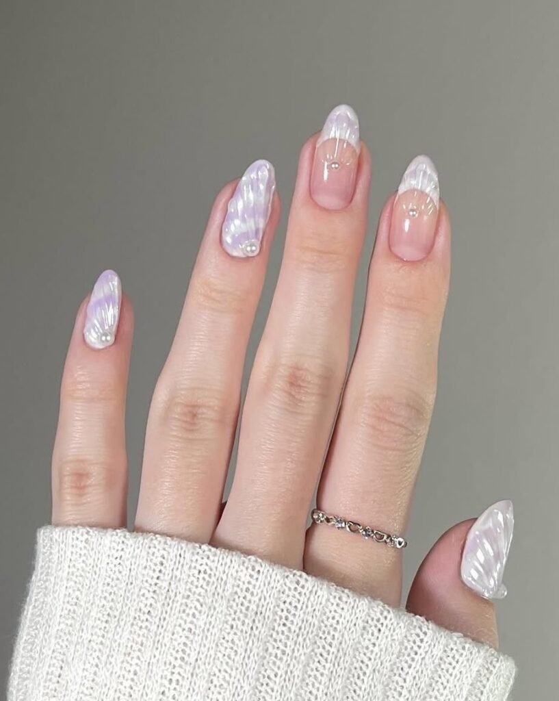 These nails look like they came straight out of a dreamy underwater fantasy. The soft lilac tones paired with pearlescent shell textures create that magical mermaid aesthetic that’s impossible to ignore.