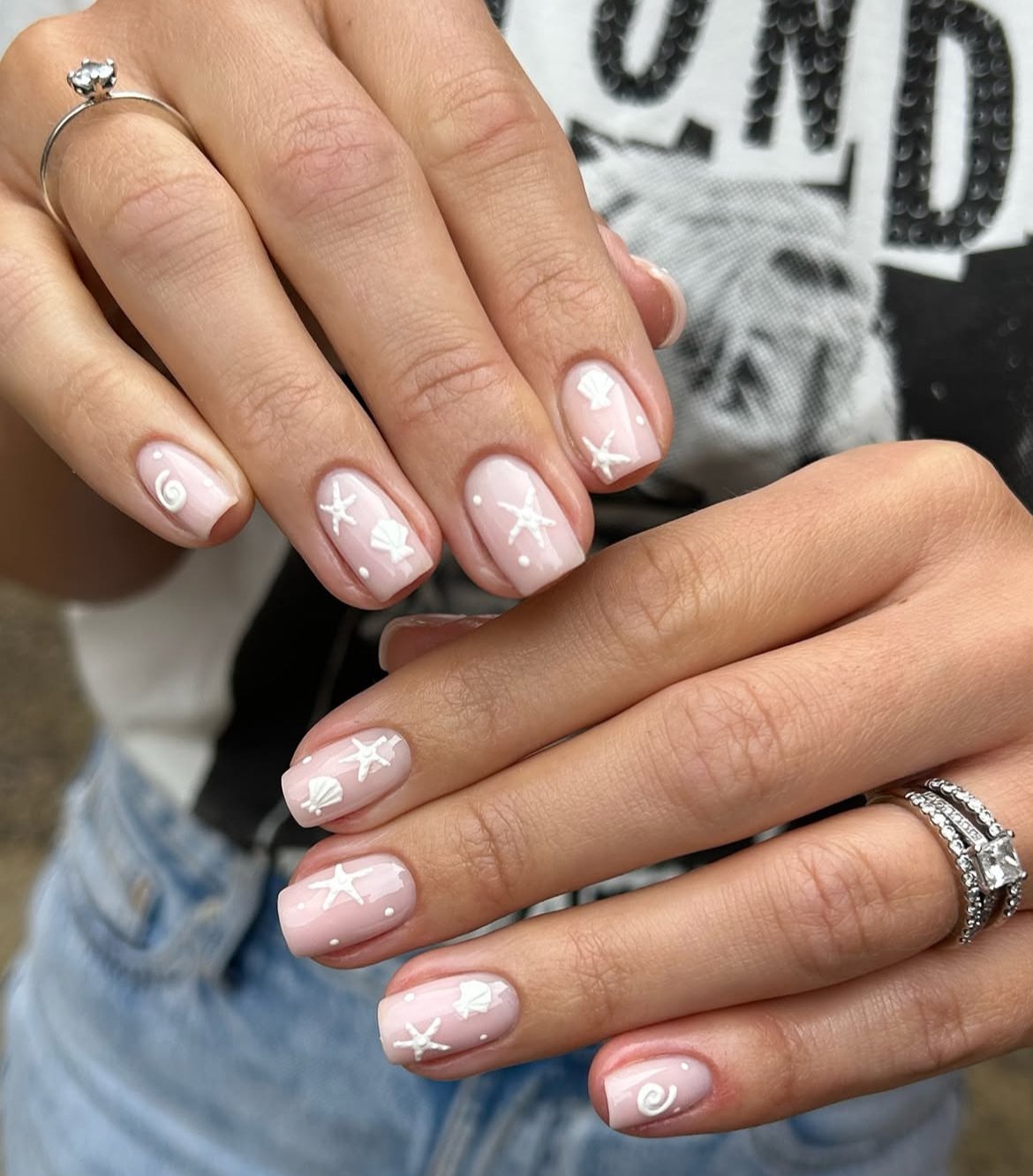 These nails take a softer, more minimal approach to beach designs. The sheer pink base keeps everything delicate, while the tiny white seashells, starfish, and ocean-inspired details feel clean and subtle.