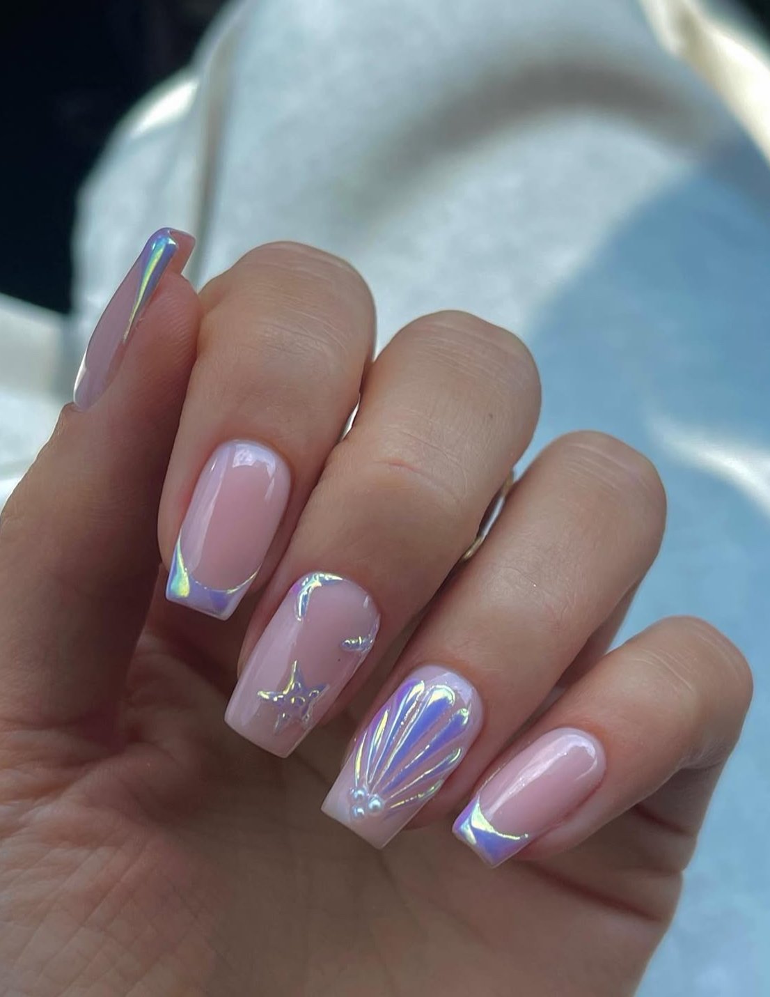 These nails have that dreamy “mermaid treasure” vibe. The soft nude base paired with iridescent chrome details gives the manicure a subtle shimmer that changes in the light—almost like sunlight reflecting off seashells.