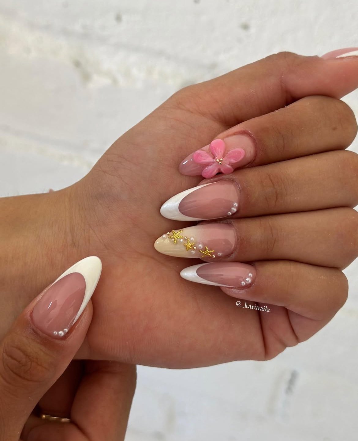 This set feels like a tiny beach vacation captured on your fingertips. The soft nude base keeps everything elegant, while the crisp white French tips add that clean, classic feel. But the real star here is the mix of beachy details—little gold starfish, pearls, and that adorable pink 3D flower that instantly gives it a playful summer vibe.