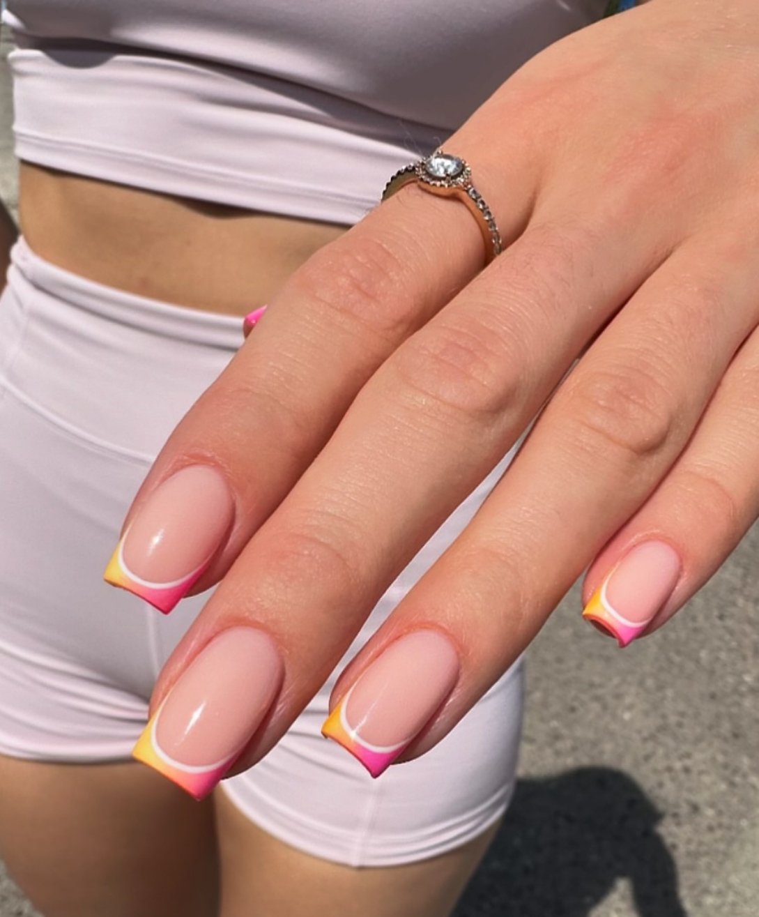 If sunsets on the beach had a nail design, it would probably look like this. The clean nude base keeps things minimal while the tips fade from warm yellow into hot pink, mimicking those glowing sunset colors.