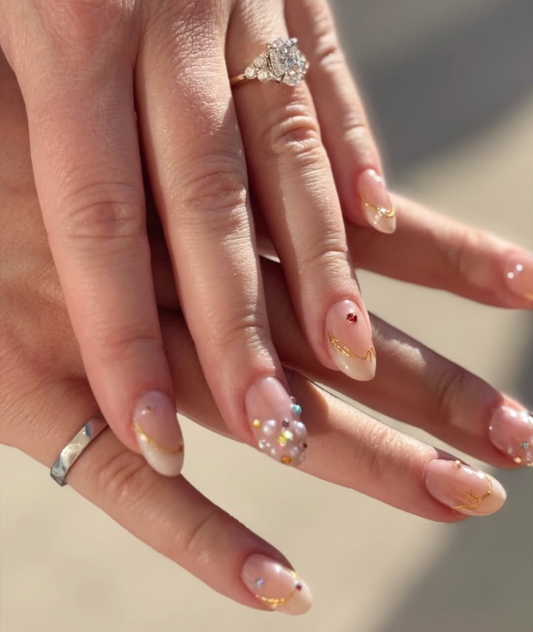 Clear nudes, soft shimmer, and scattered gems — this set has that sunlit sparkle that hits right after waves crash. It’s simple, warm, and almost glowing, like jewelry for your fingertips.