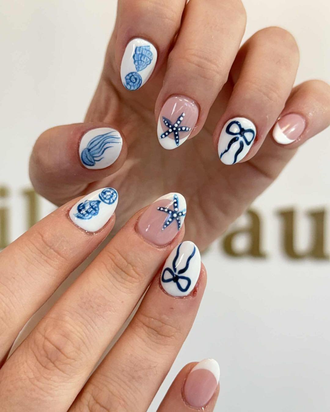 These nails look like someone painted your favorite porcelain vase… but make it beach-core. The crisp blue detailing against the soft nude base gives total “washed up treasures found at low tide” energy. Each tiny shell and starfish is hand-drawn perfection—delicate, nautical, and just the right amount of playful.