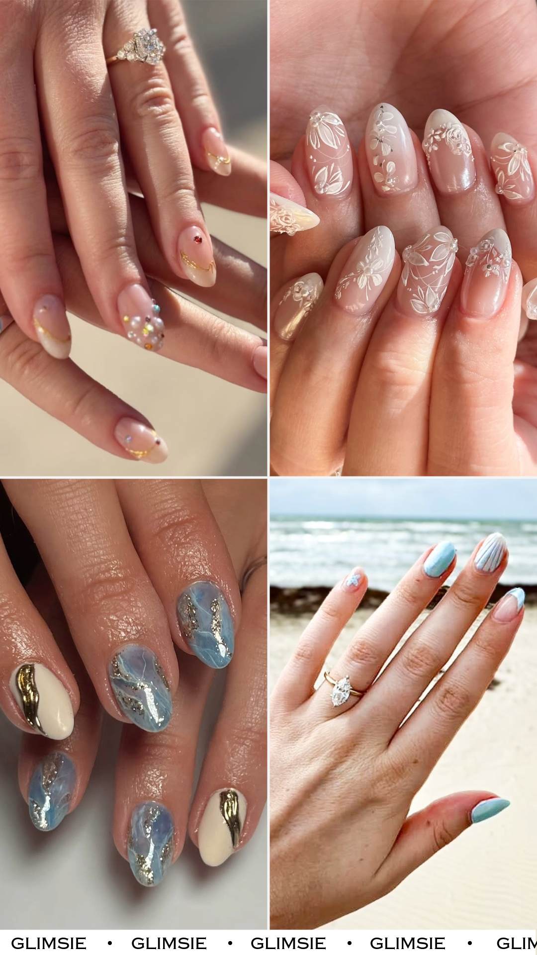In this list, you’ll find inspiration for every nail shape and bridal style, from minimal coastal chic to gentle floral and seashell-inspired accents. Get ready to explore beach wedding nail ideas that feel timeless, luminous, and perfectly suited for saying “I do” by the sea.